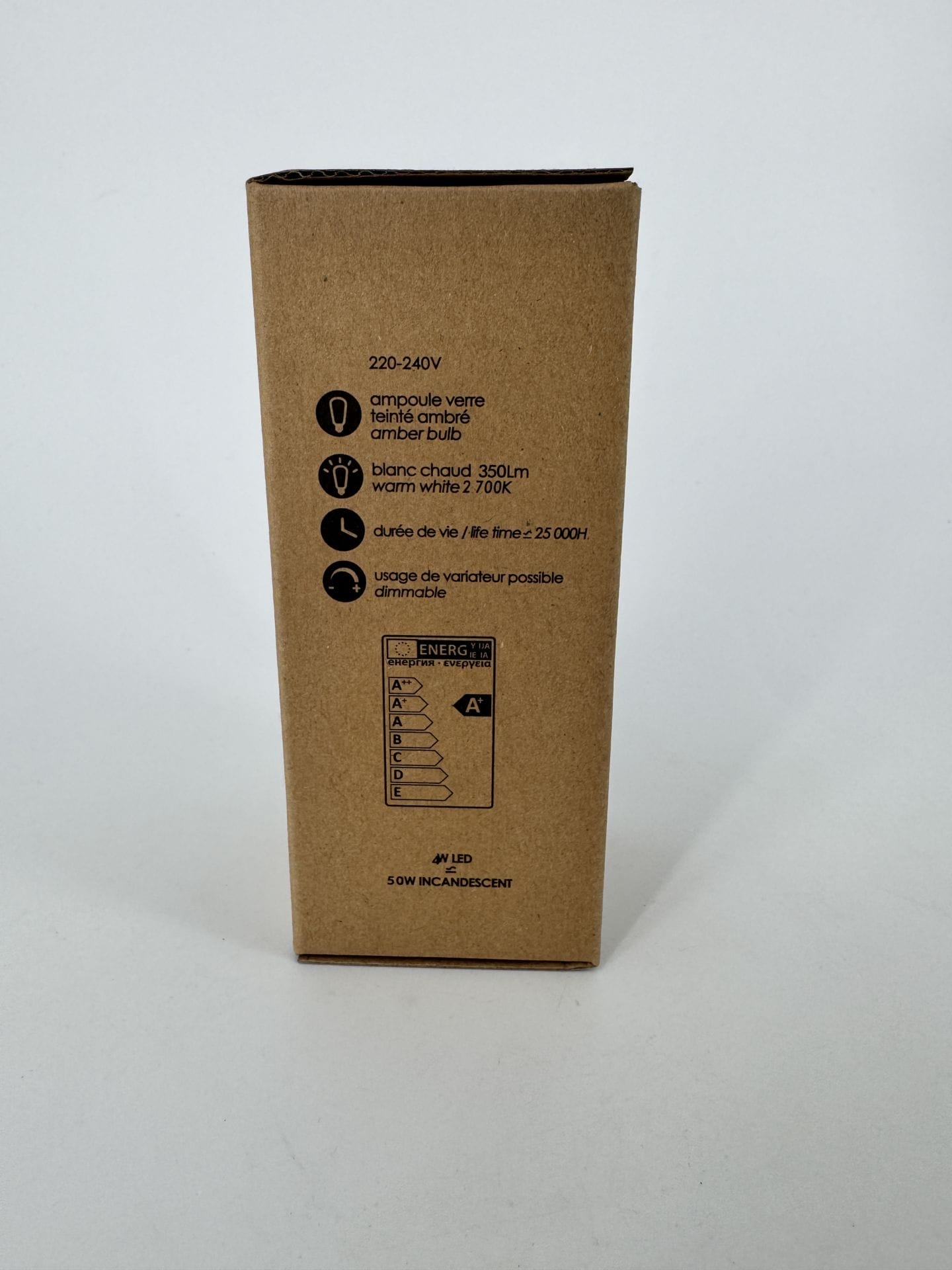 Ampoule E27 Opjet LED filament Bulb 4W 50w incandescent – vintage 220-240V 50Hz – ampoule verre teinté ambré – blanc chaud 200Lm – usage de variateur possible – Ref 012854