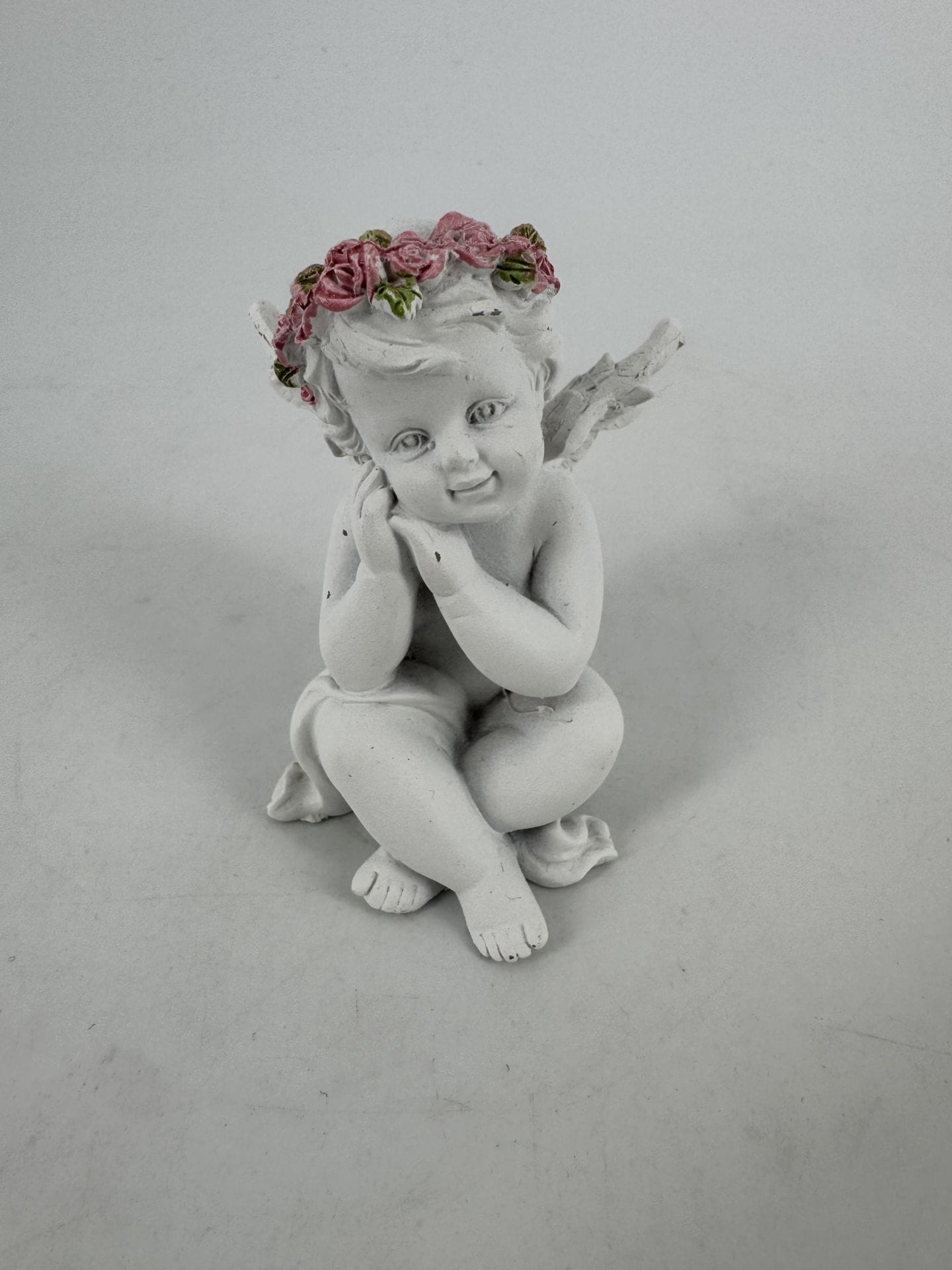 Ange élégant assis les mains sous le visage décoré de fleurs roses. Parfait pour une ambiance douce et romantique.
