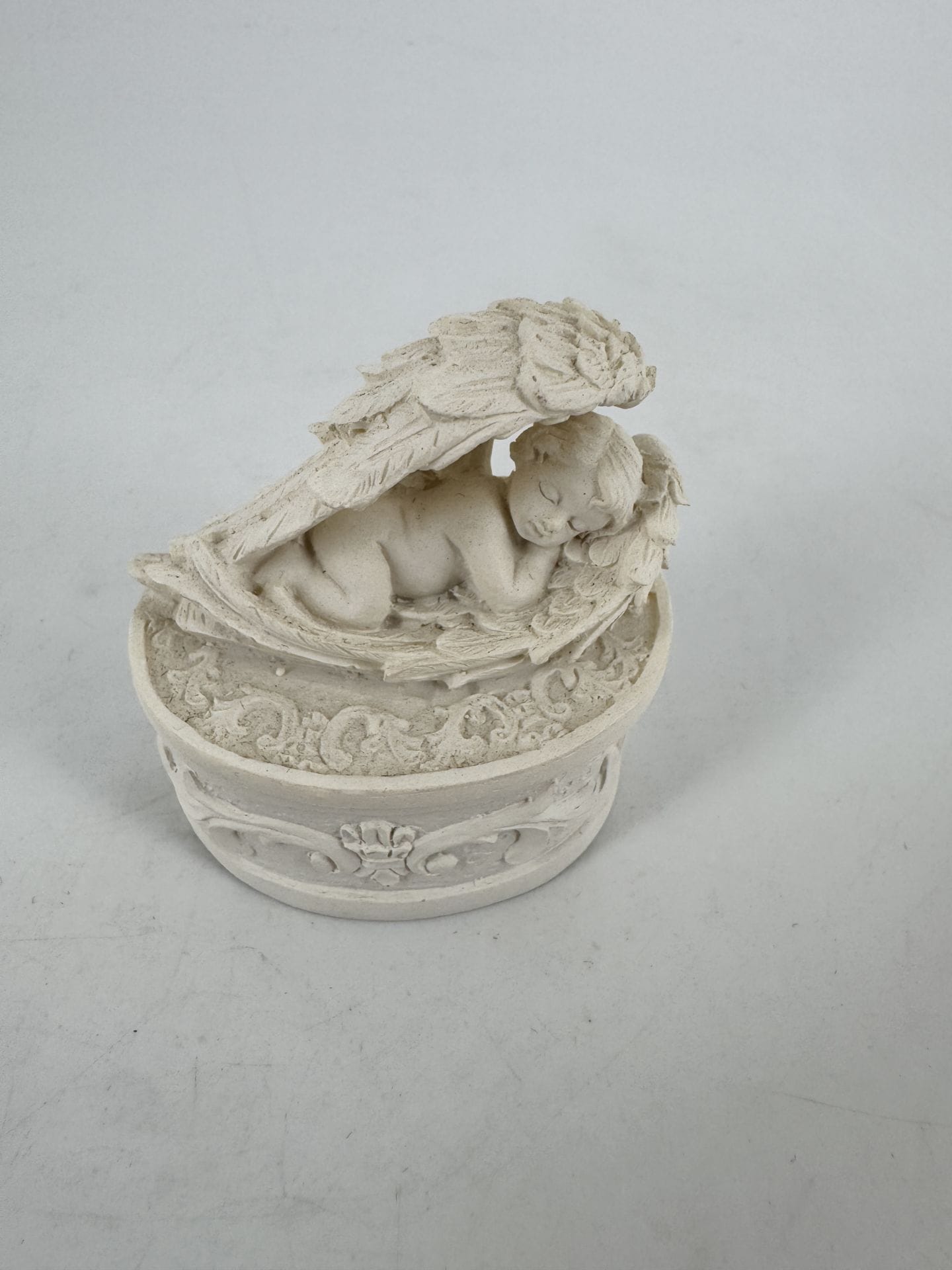 Petite boîte décorative ornée d’un ange dormant vers la gauche, idéale pour ranger bijoux ou petits objets symboliques.