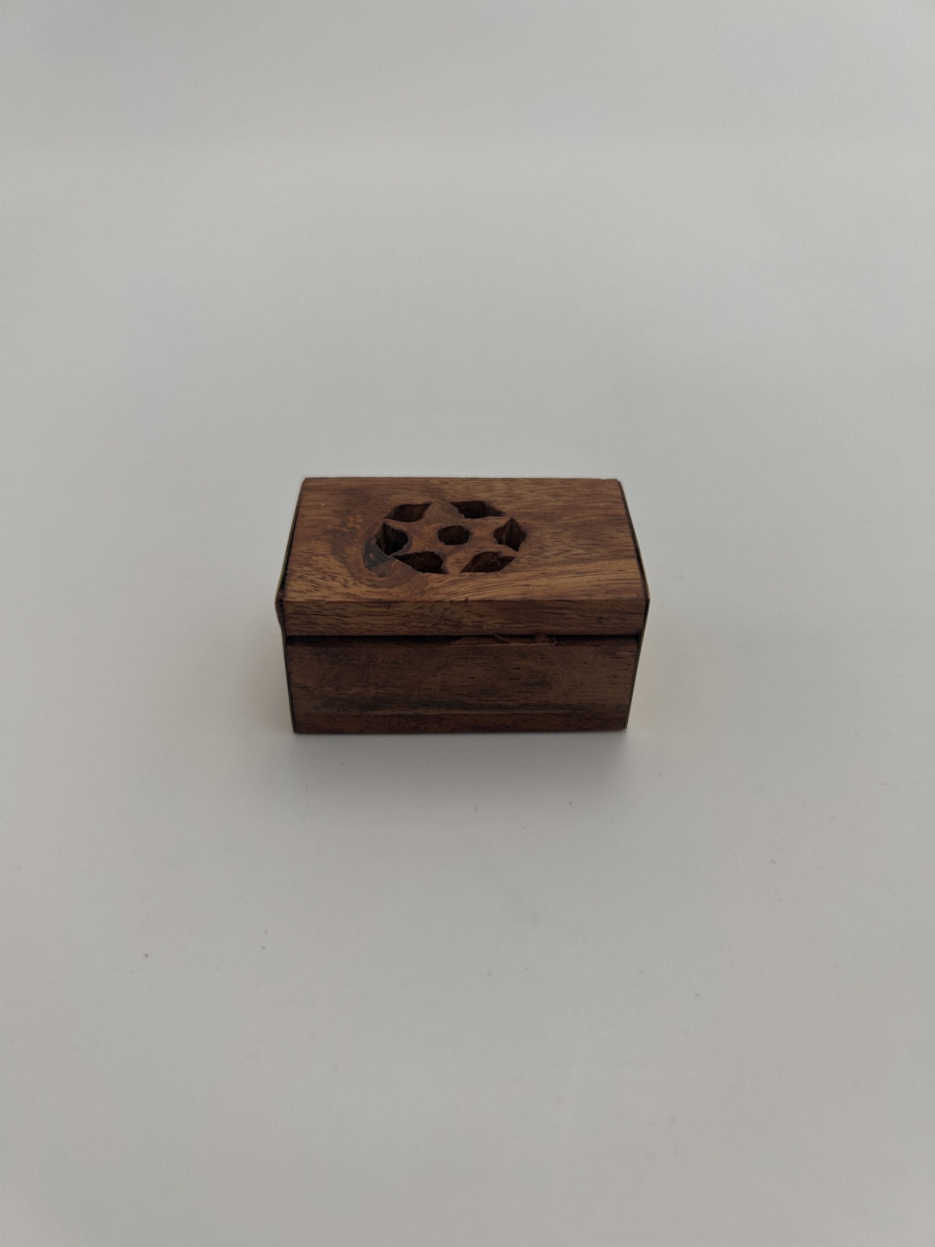 Petit boîtier ajouré en bois. Pour mettre de l’ambre. Conseils pratiques : en plaçant de l’ambre dans une armoire ou un tiroir, son arôme suave imprègnera le lieu tout en délicatesse. Ilsera aussi très apprécié dans la voiture.