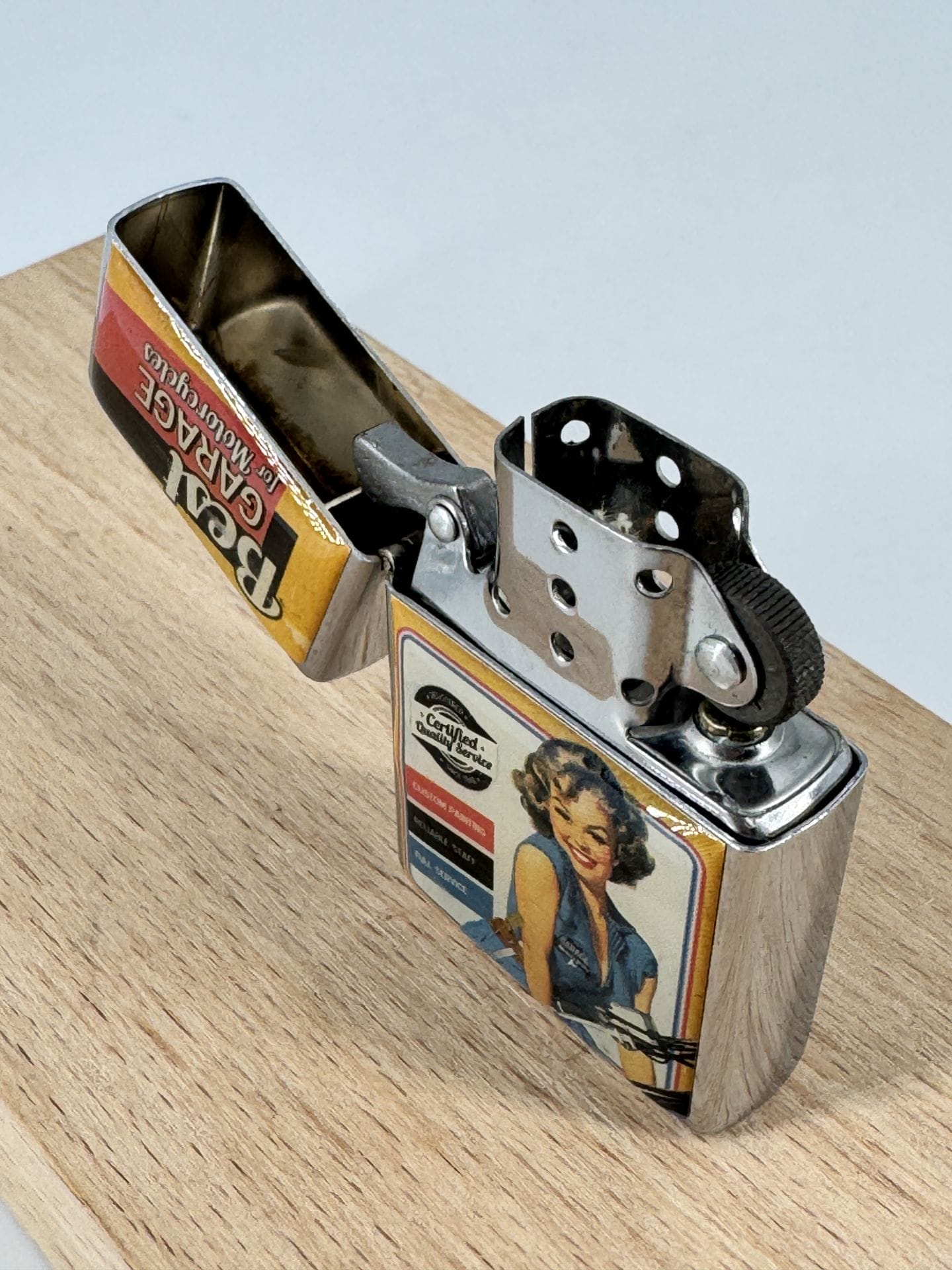 Étiquettes : accessoire vintage, art rétro, Best Garage, biker, briquet tempête, cadeau moto, cadeau original, flamme résistante au vent, garage de moto, illustration rétro, jaune, moto, pin up, style vintage, We're Open on Sundays