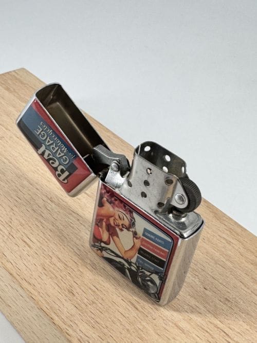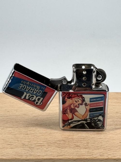Étiquettes : accessoire vintage, art rétro, Best Garage, biker, briquet tempête, cadeau moto, cadeau original, flamme résistante au vent, garage de moto, illustration rétro, moto, pin up, rouge, style vintage, We're Open on Sundays