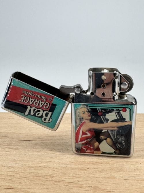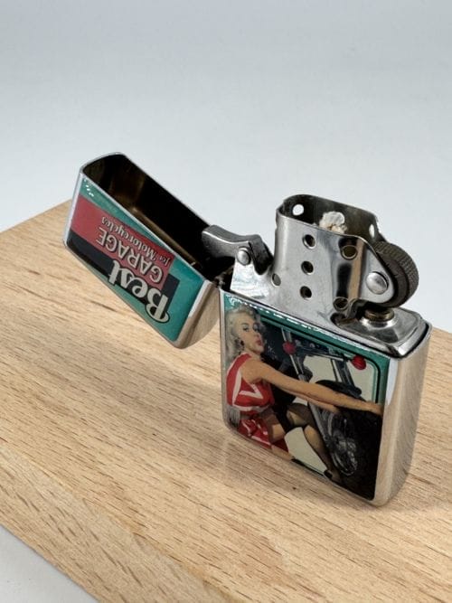 Ce briquet tempête vert Moto Best Garage for Motorcycles arbore une illustration Pin Up rétro, accompagnée du message « We’re Open on Sundays », inspiré des garages de motos classiques. Son design vintage allie élégance et durabilité, offrant une flamme résistante au vent, idéale pour les passionnés de motos et de culture rétro. Ce briquet est un accessoire incontournable pour les amateurs de motos et de l’art des années 50. Parfait pour ceux qui apprécient le style biker avec une touche de charme vintage.
