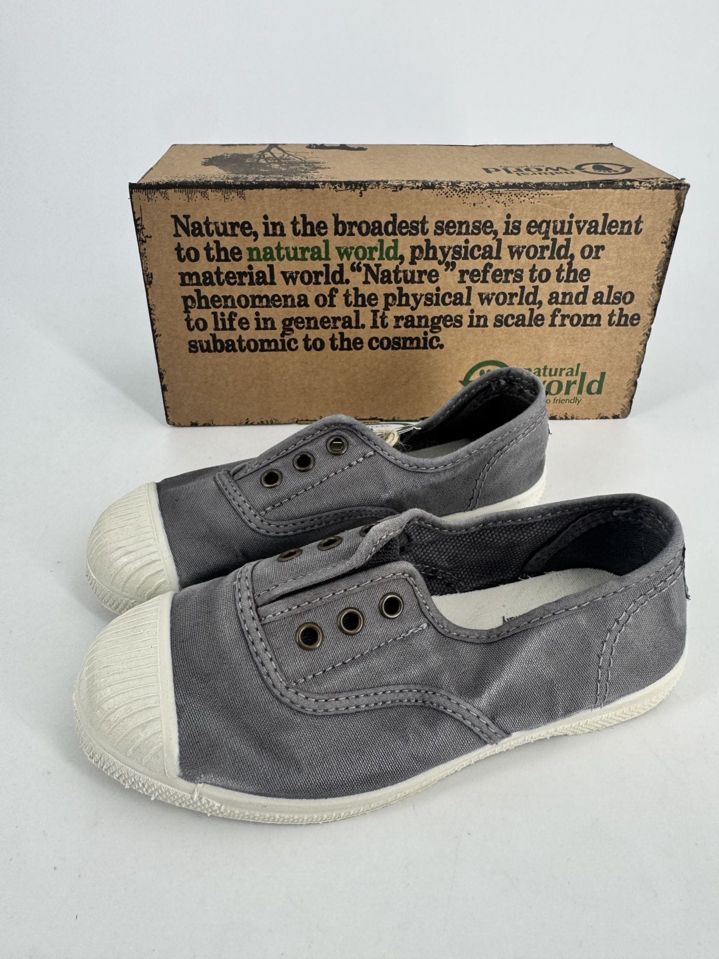 Étiquettes : 470e 623, baskets enfant​, confort, coton bio, écologique, gris enz, natural world, neutre, pointure 29, toile élastique