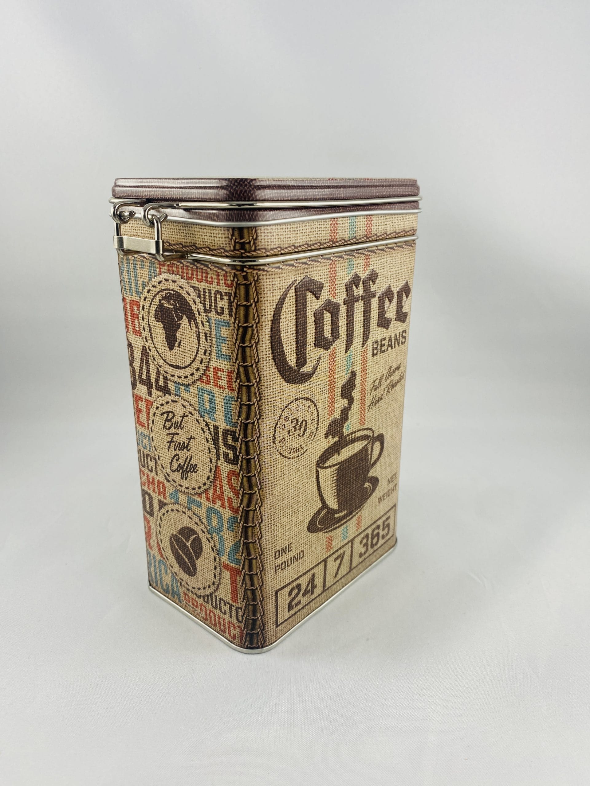 Boîte à café hermétique vintage en métal avec reliefs ‘Coffee Imports Coffee Beans Full Aroma Hand Roasted’, fermeture par loquet basculant.