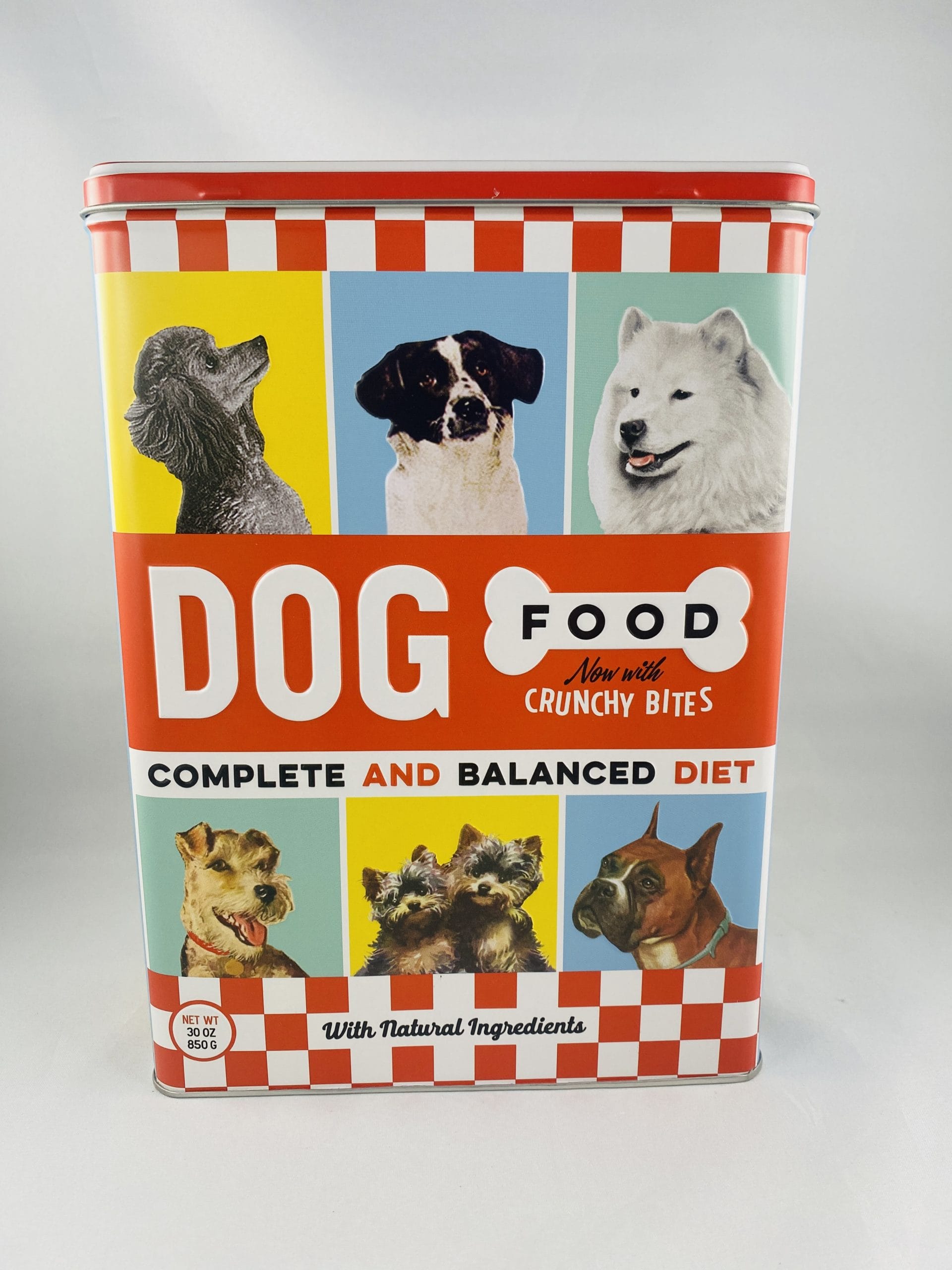 Boite vintage en métal ‘Dog Food Now with crunchy bites dinner time’ avec reliefs pour sucre, gateaux, rangement bibelots, papiers.