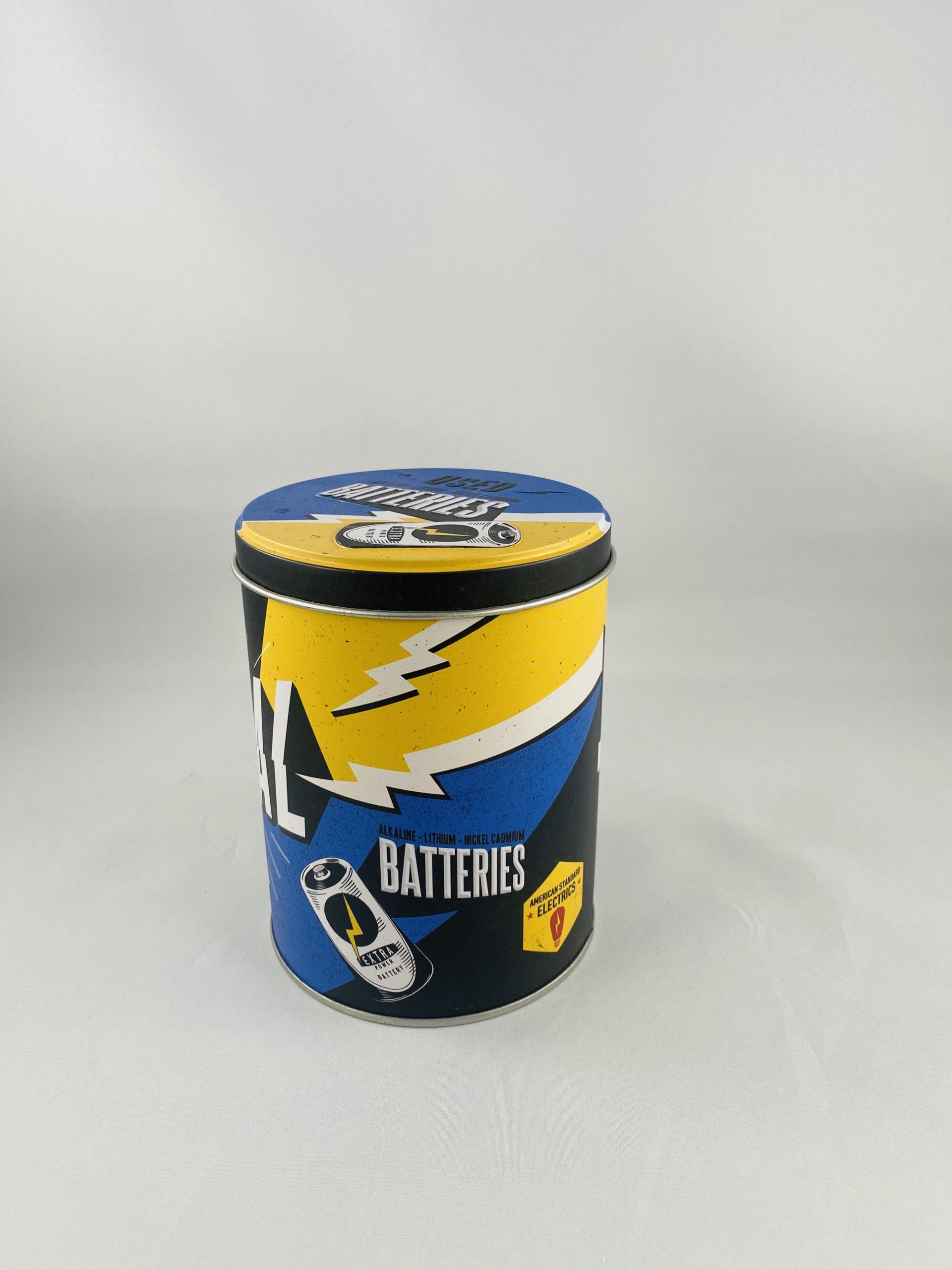 Boite vintage ‘Electrical Genuine parts Equipment Used batteries’ en métal ronde pour sucre, gateaux, rangement bibelots, papiers.