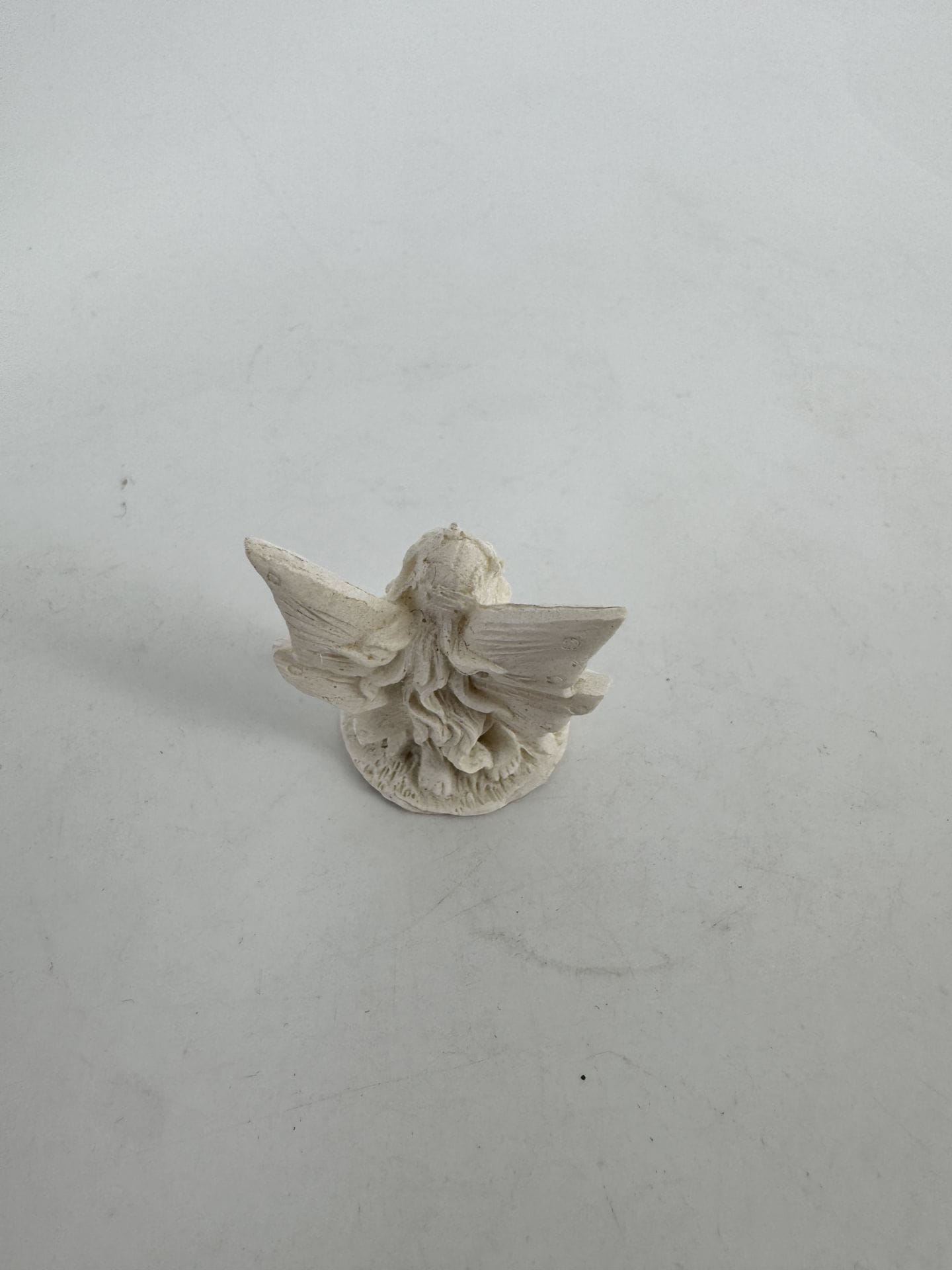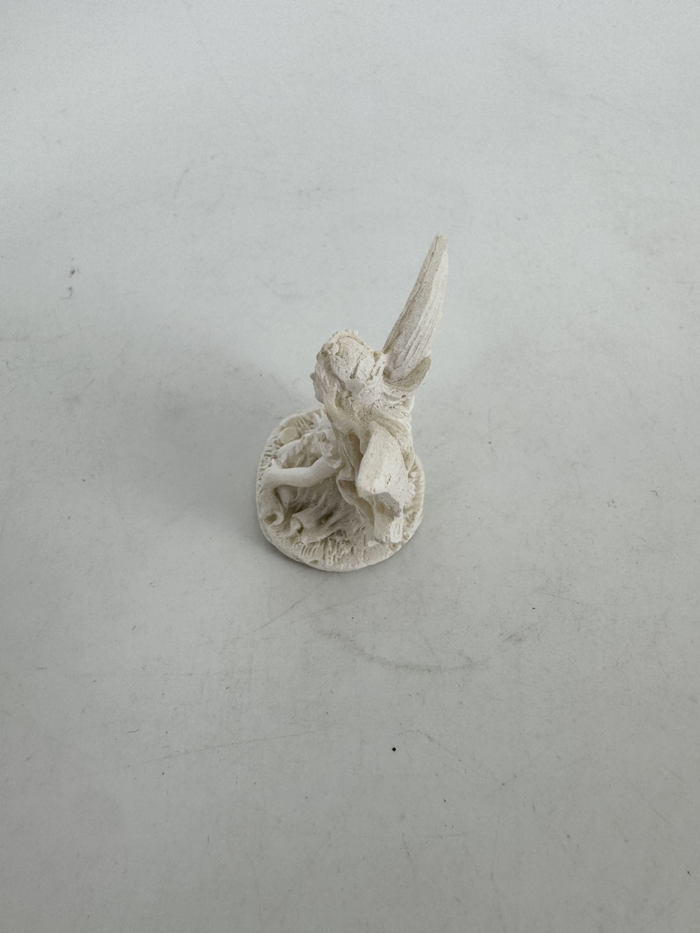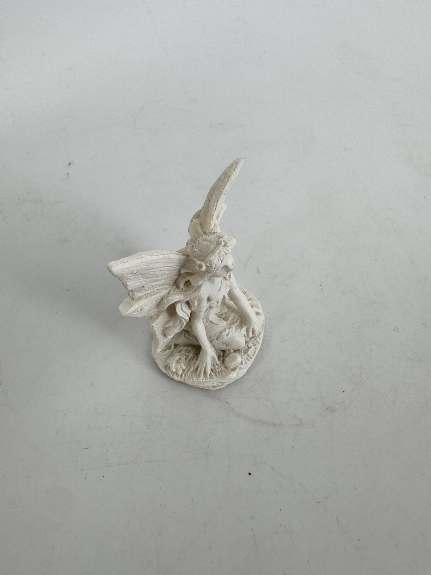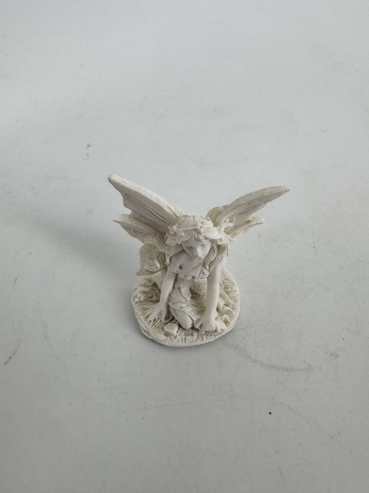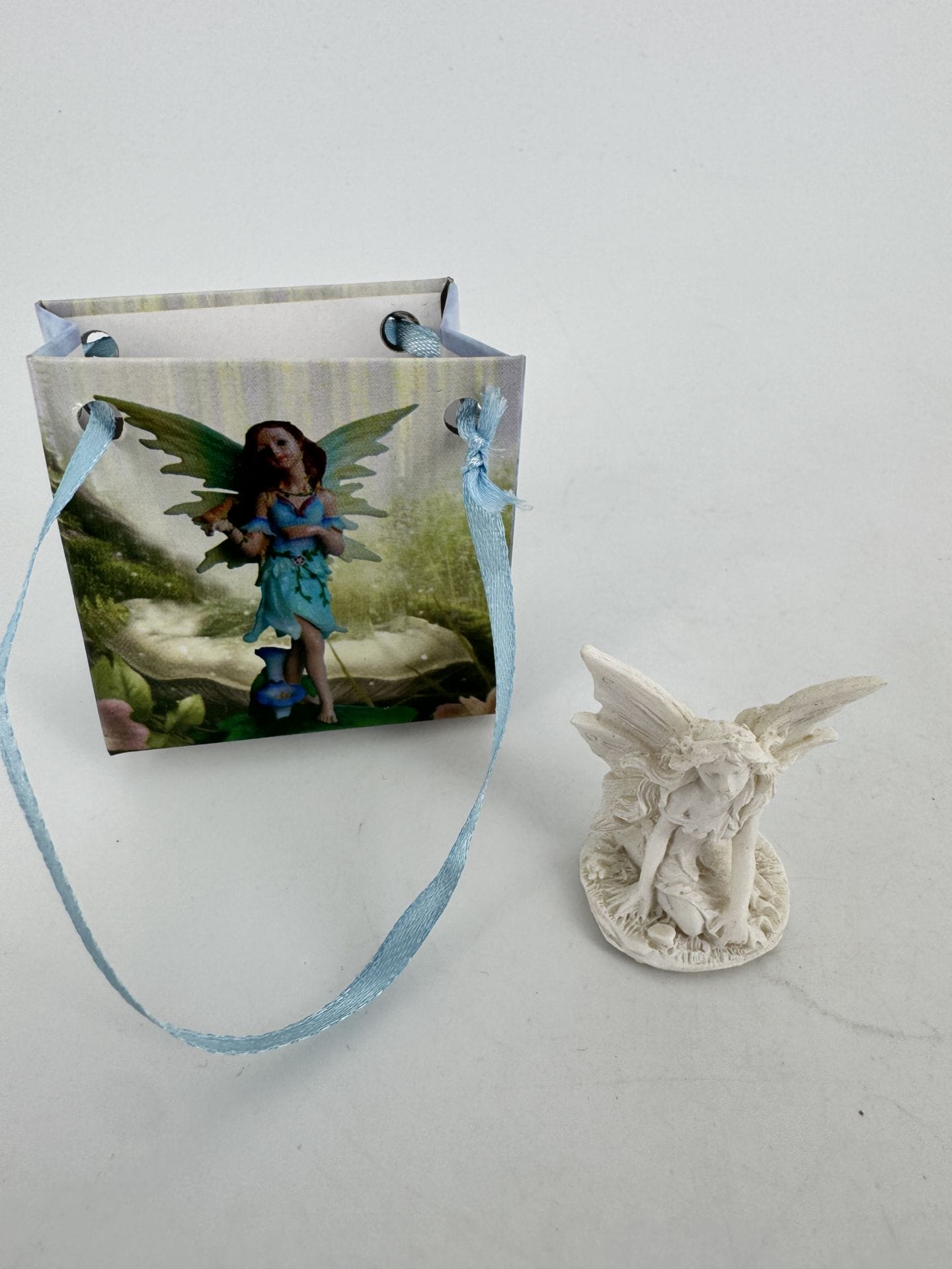 Petite fée à genoux vendue dans sa boîte, parfaite pour une décoration magique ou une collection de figurines féeriques.