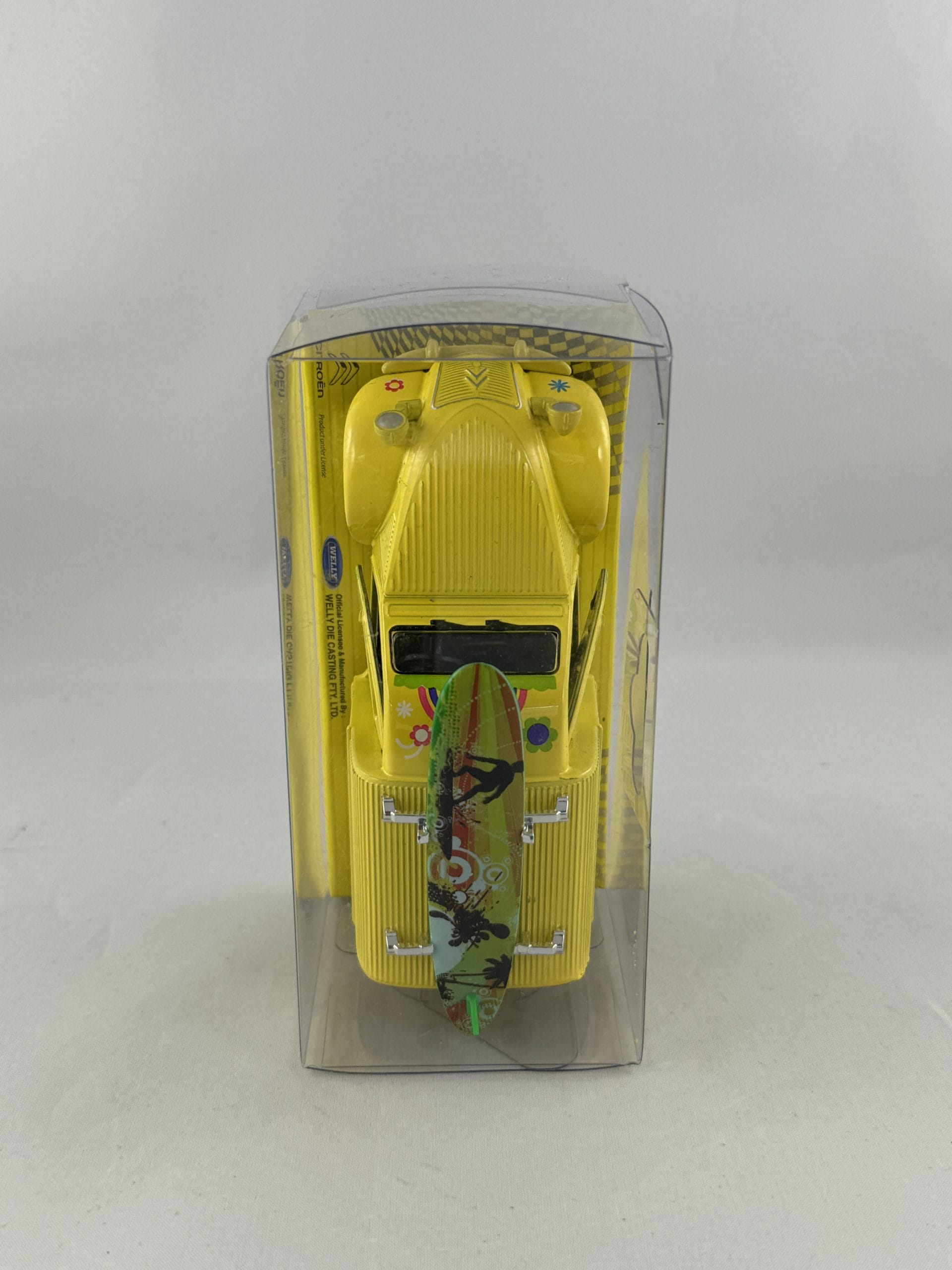 Voiture miniature 2CV Citroën Fourgonnette jaune réplique fidèle à l’échelle 1/34, version hippie avec sur sa galerie une planche de surf verte représentant des surfeurs. Les dimensions indiquées sont celles de la boite translucide dans laquelle se trouve la voiture.