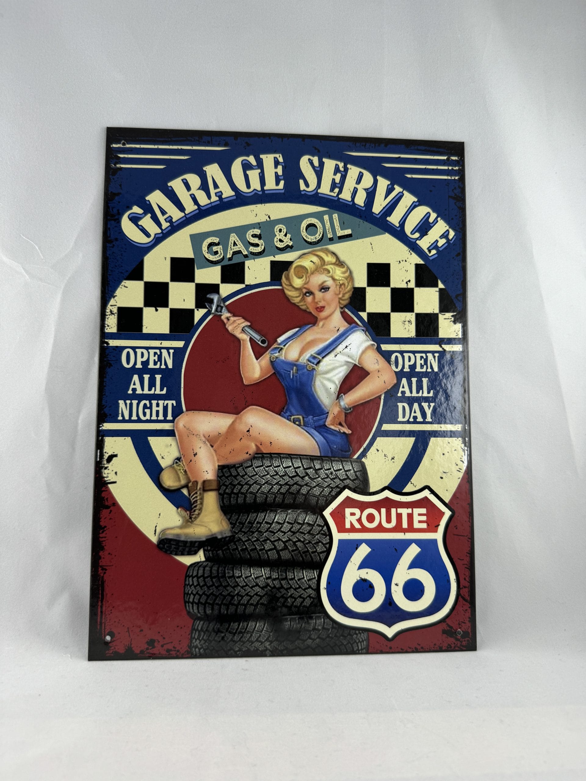 Plaque de style vintage cartonnée Garage Service – Gas & oil – Open all night, open all day – Route 66