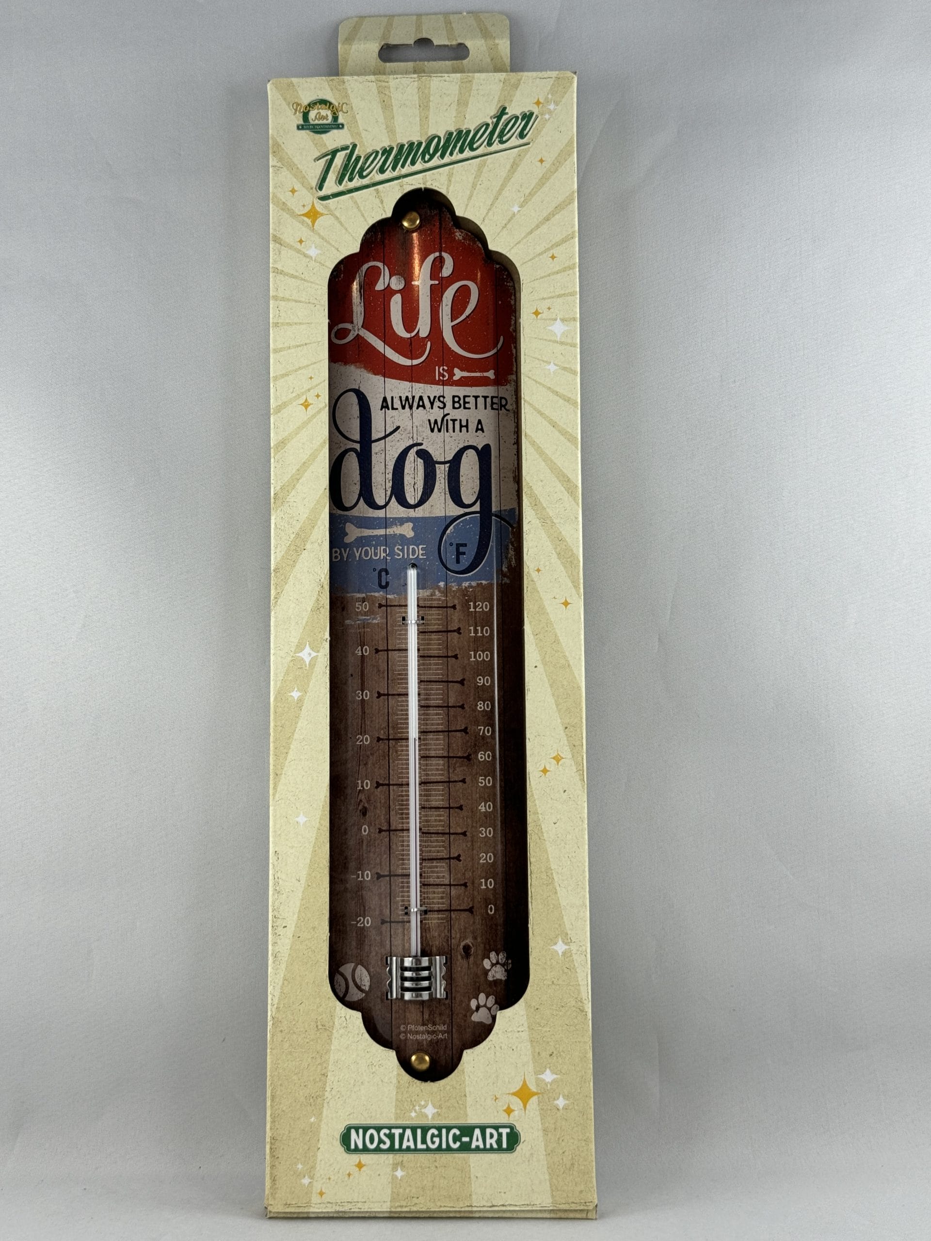 Thermomètre en métal à double lecture, en degrès Celcius et degrès Farenheit. Deux points de fixation. Encore sous emballage d’origine.