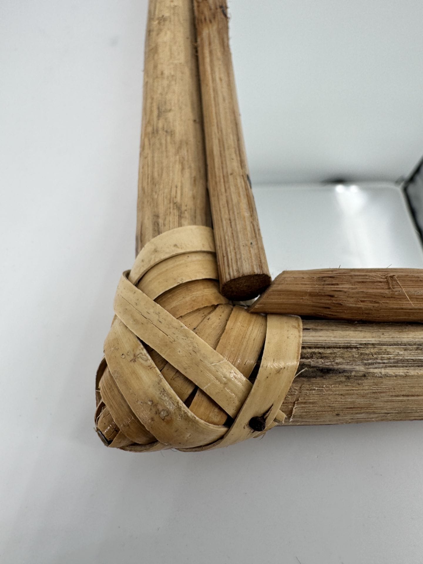 Beau miroir aux formes arrondies réalisé en bois de bambou, idéal pour apporter une note naturelle à votre déco.