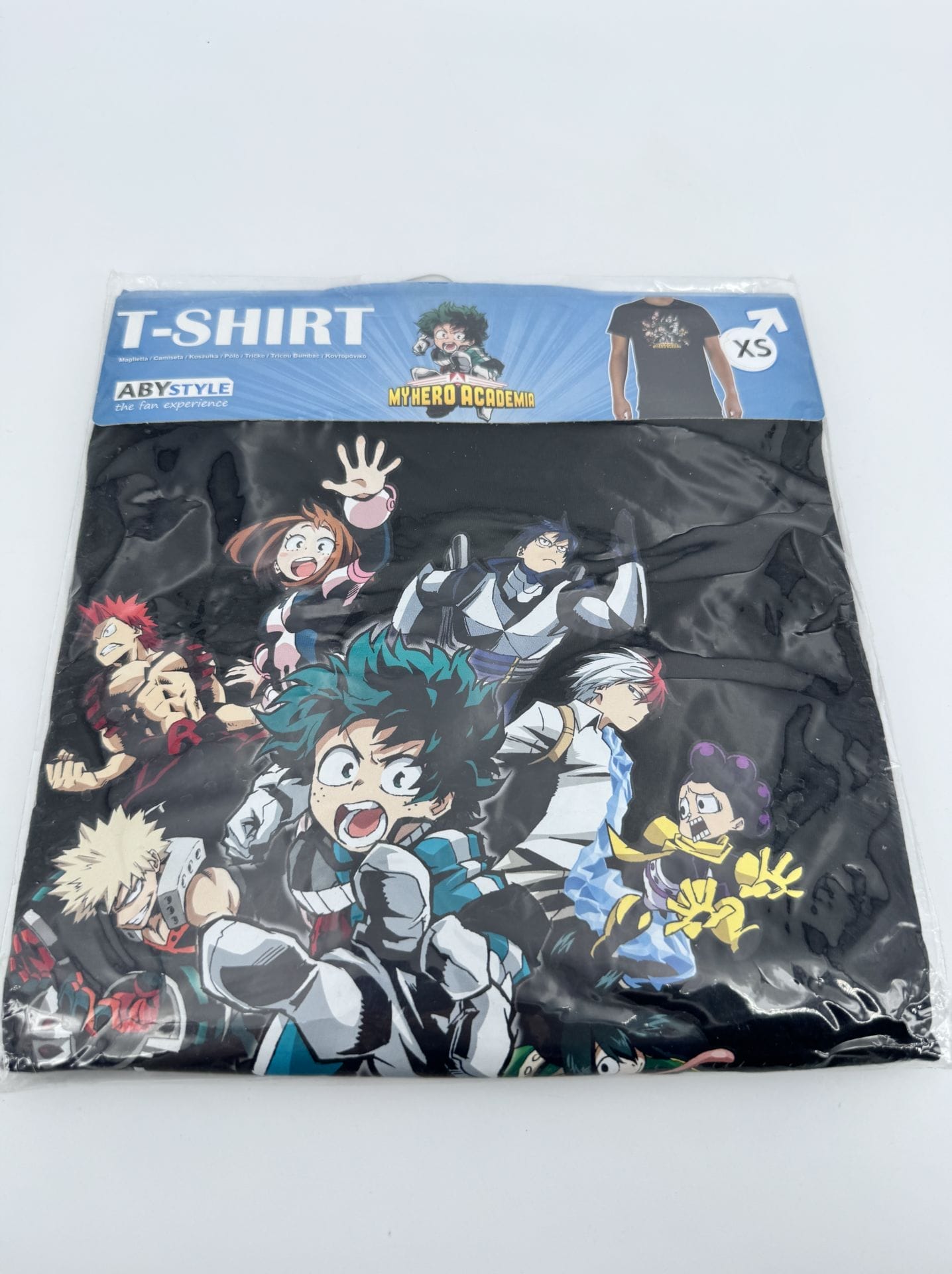 T-shirt officiel sous licence My Hero Academia (réf ABYTEX479), taille XS homme, marque Abystyle. Motif inspiré des héros de l’anime, coupe ajustée, parfait pour les fans du manga et du style japonais-streetwear.