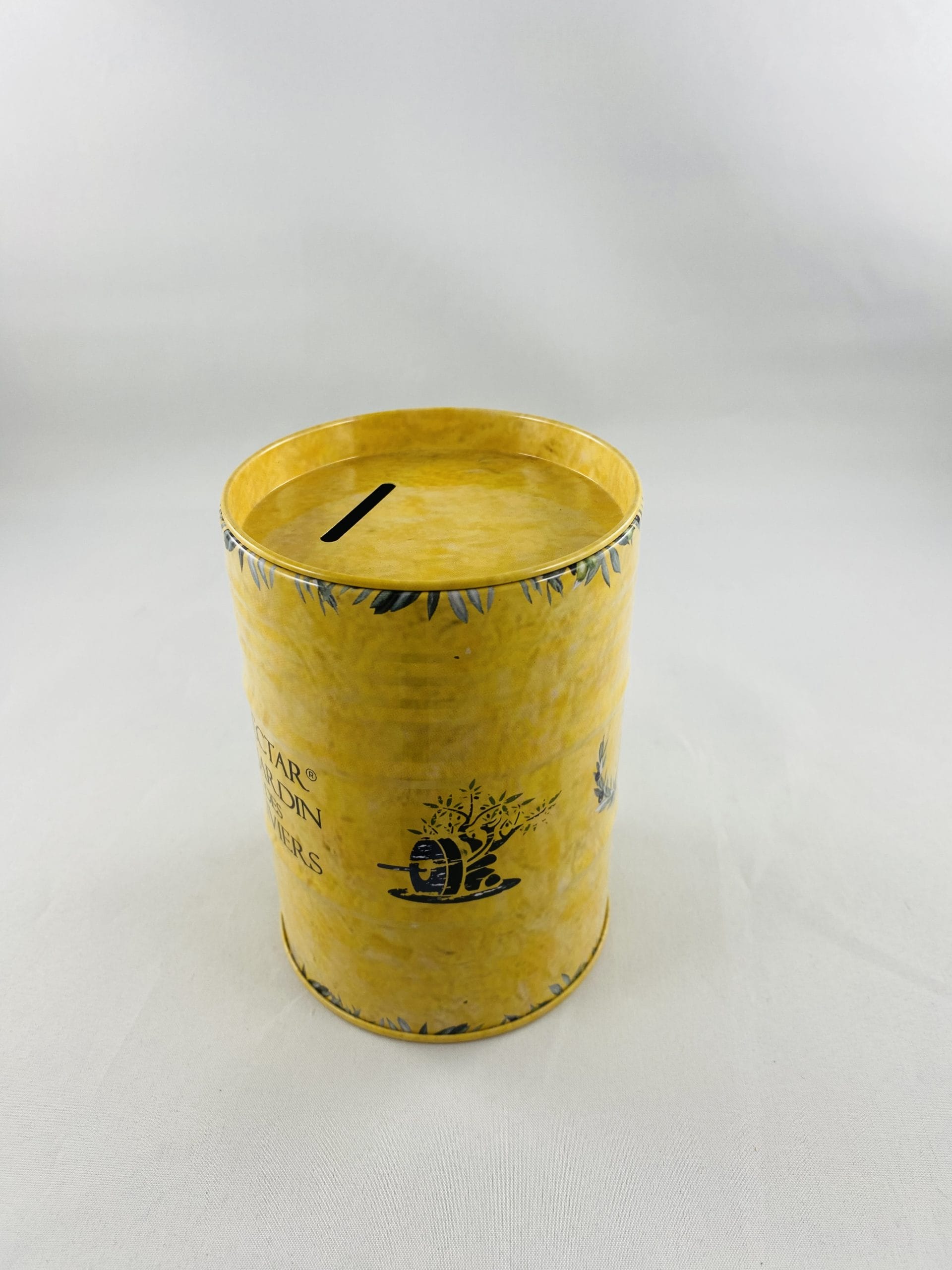 Tirelire ronde en métal ‘Nectar du jardin des oliviers – Huile d’olive de Provence pressée à froid’ en forme de bidon d’huile, avec les anneaux en relief, pouvant également servir de pot à crayons.
