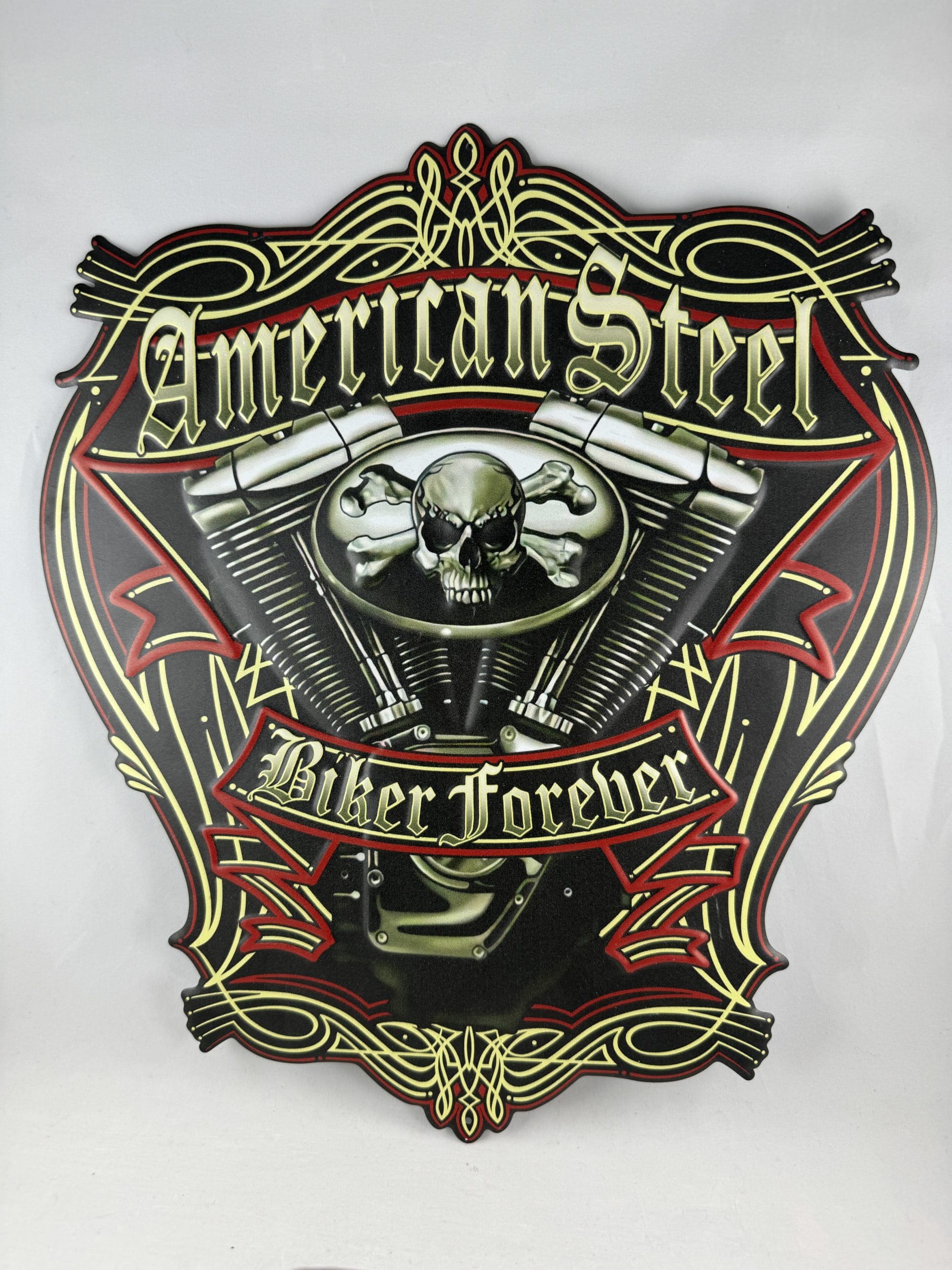 Plaque en métal de style vintage avec éléments reliefs American Steel – Biker forever