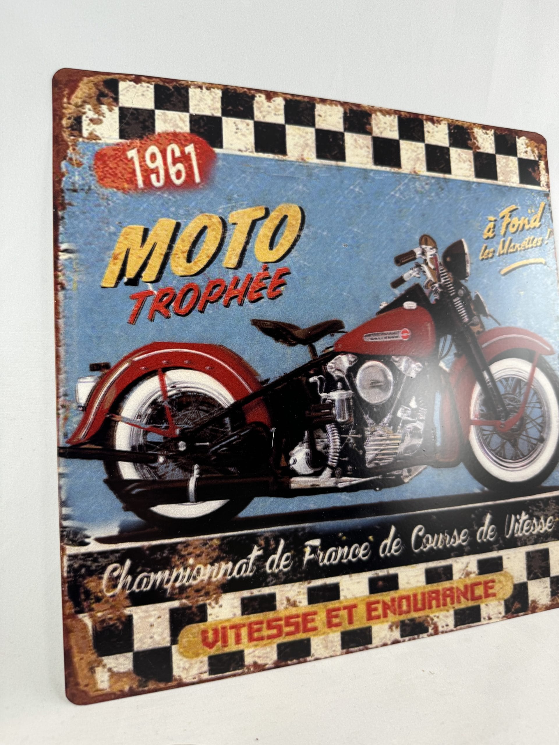 Plaque métal vintage Moto Trophee 1961 – A fond les manettes ! – Championnat de France de course de vitesse – Vitesse et endurance