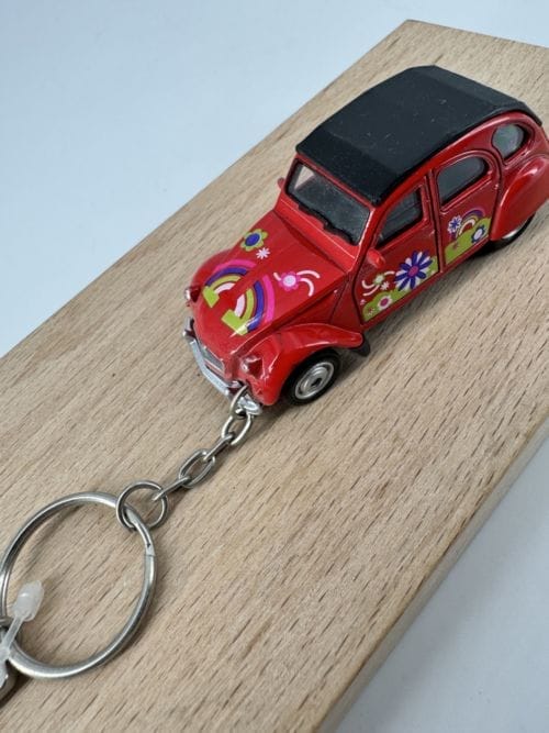 Un porte-clés charmant avec une 2 CV rouge en volume, inspiré de l’esprit Peace and Love, pour les passionnés de voitures rétro et de l’époque hippie.