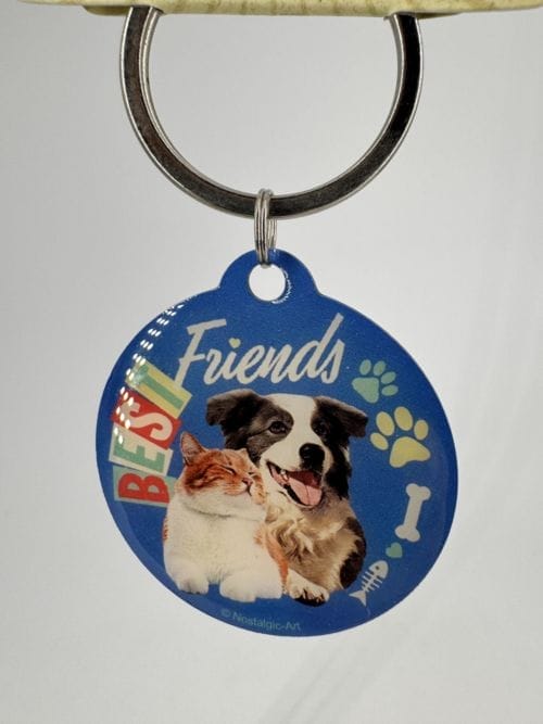 Un porte-clés rond et touchant « Best Friends » avec un chien, dans le style vintage de Nostalgic Art, célébrant le lien unique et fort entre l’humain et son compagnon à quatre pattes.