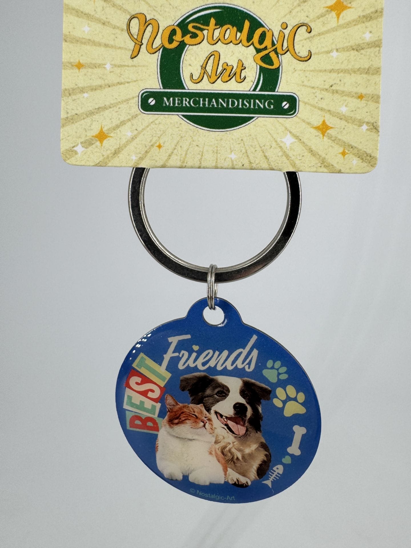 Un porte-clés rond et touchant « Best Friends » avec un chien, dans le style vintage de Nostalgic Art, célébrant le lien unique et fort entre l’humain et son compagnon à quatre pattes.