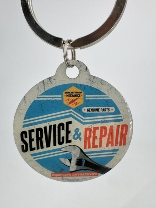 Un porte-clés rond Service and Repair dans le style vintage de Nostalgic Art, parfait pour les passionnés de mécanique et d’automobile rétro.