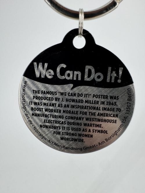 Ce porte-clés rond We Can Do It !, signé Nostalgic Art, reprend l’illustration iconique de la femme ouvrière, symbole de force, de détermination et de la lutte féministe. Inspiré des affiches de propagande américaine des années 1940, ce design vintage incarne l’émancipation des femmes et leur engagement dans le monde du travail. Un accessoire idéal pour celles et ceux qui souhaitent afficher fièrement leur soutien à l’égalité et aux valeurs féministes, tout en ajoutant une touche rétro à leurs clés. Un cadeau parfait pour les passionnés d’histoire et de design engagé.