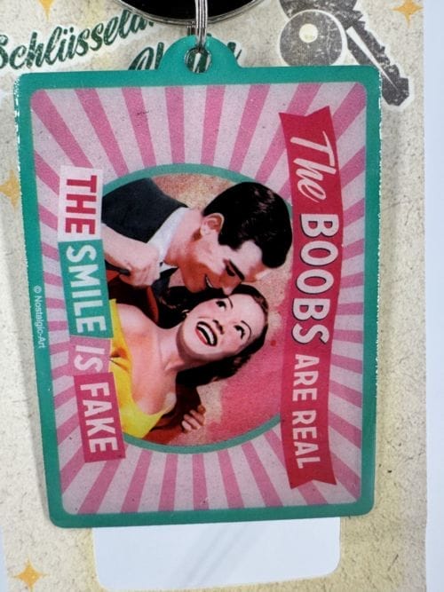 Un porte-clés audacieux et humoristique avec le slogan « The Boobs are real – The Smile is Fake » dans le style vintage reproduit par Nostalgic Art.