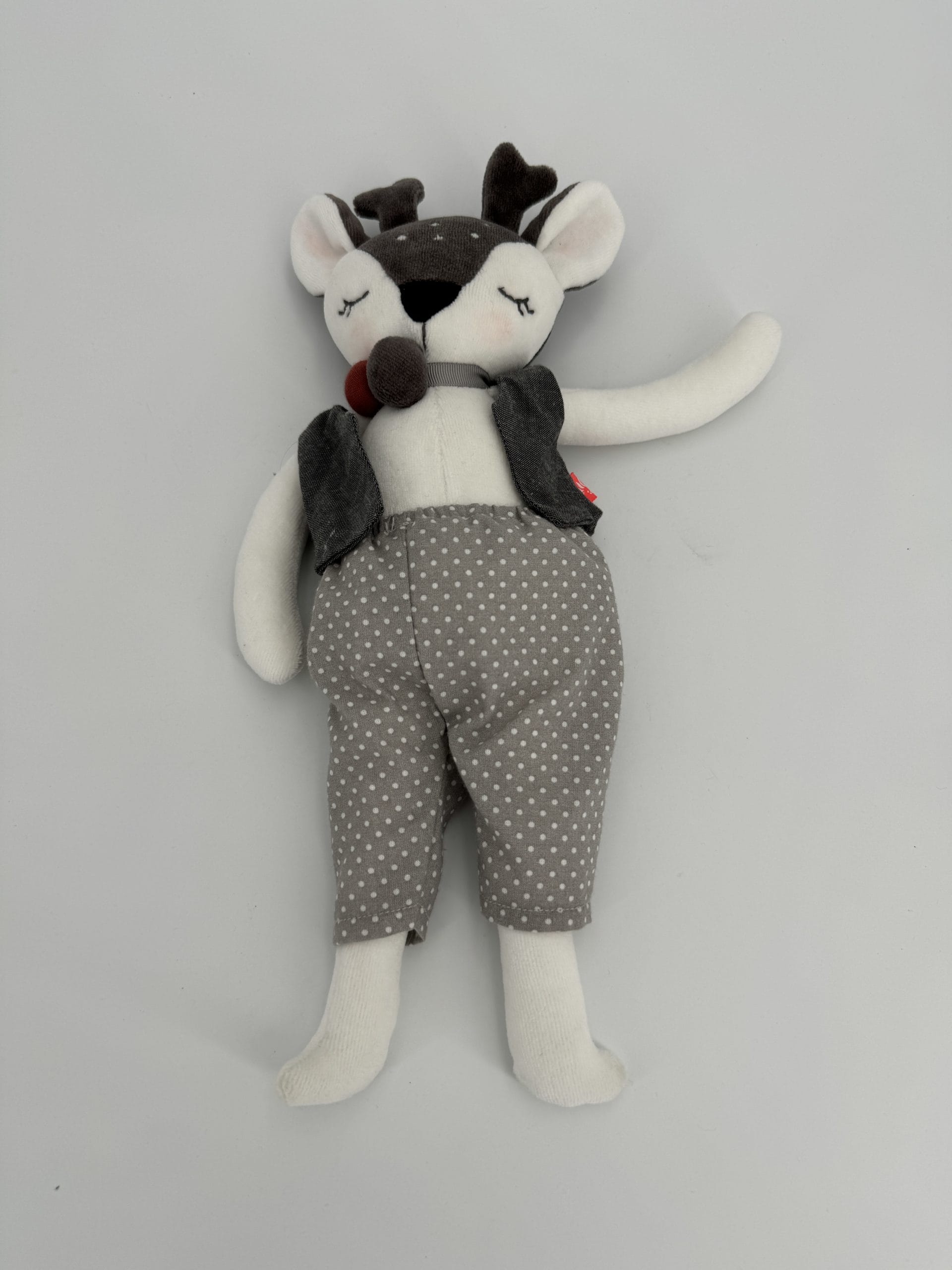 Cette jolie poupée de Monsieur faon endormi va faire craquer les petits avec ses couleurs douces, et vite se transformer en doudou indispensable. Son petit gilet et ses pompons lui donnent un vrai chic.