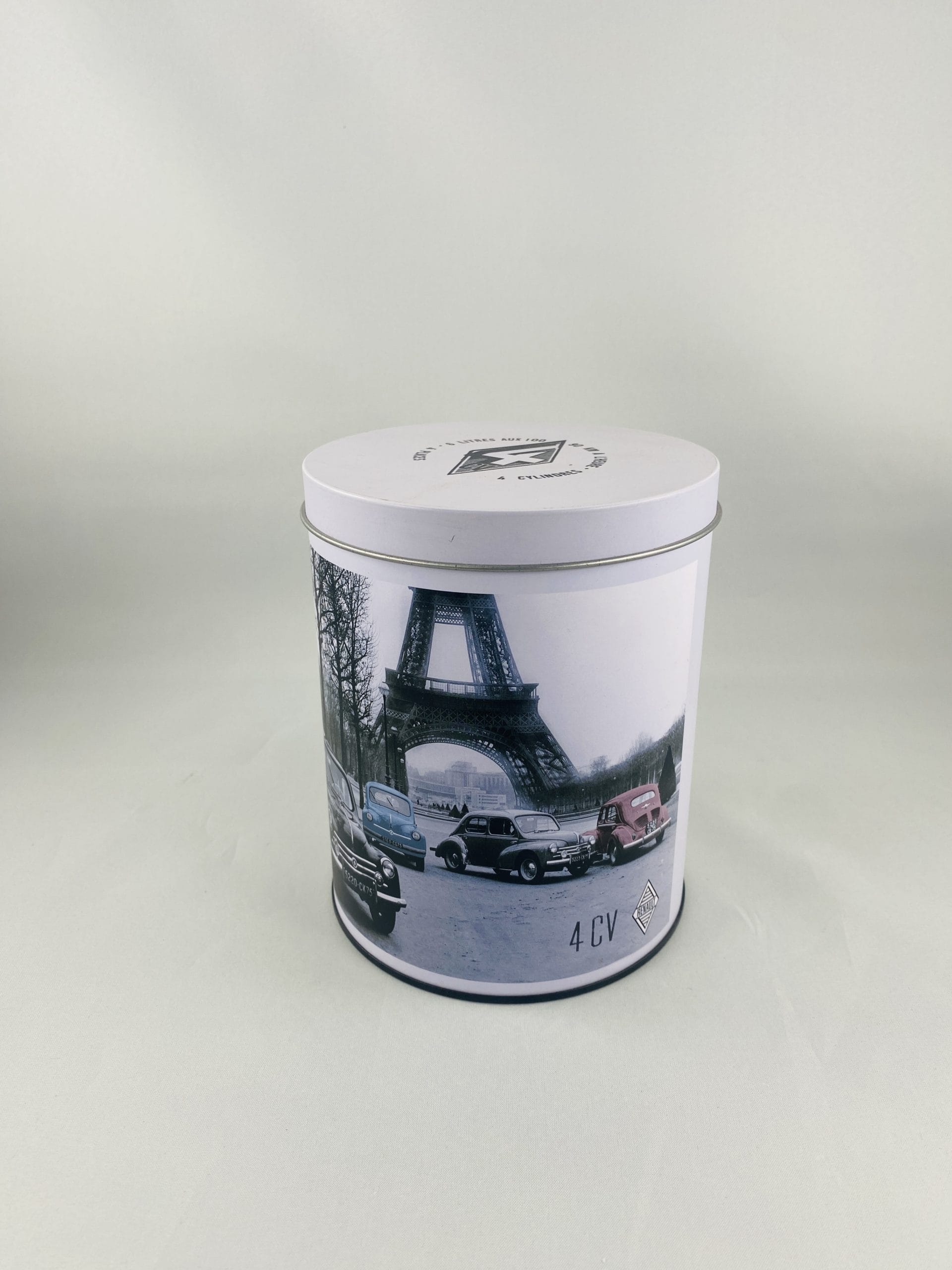 Boite vintage ‘Renault 4 CV’ en métal ronde pour sucre, gateaux, rangement bibelots, papiers.