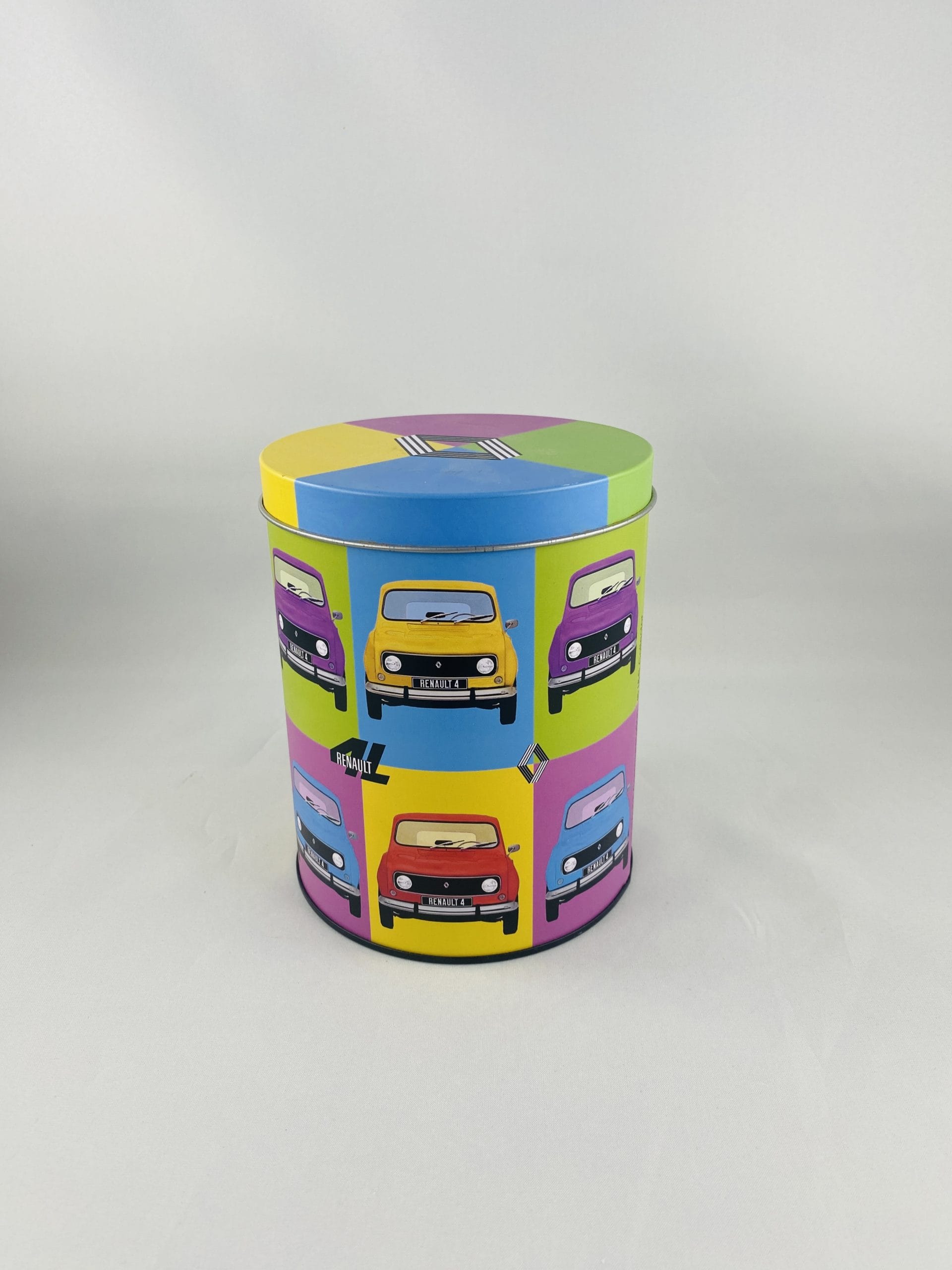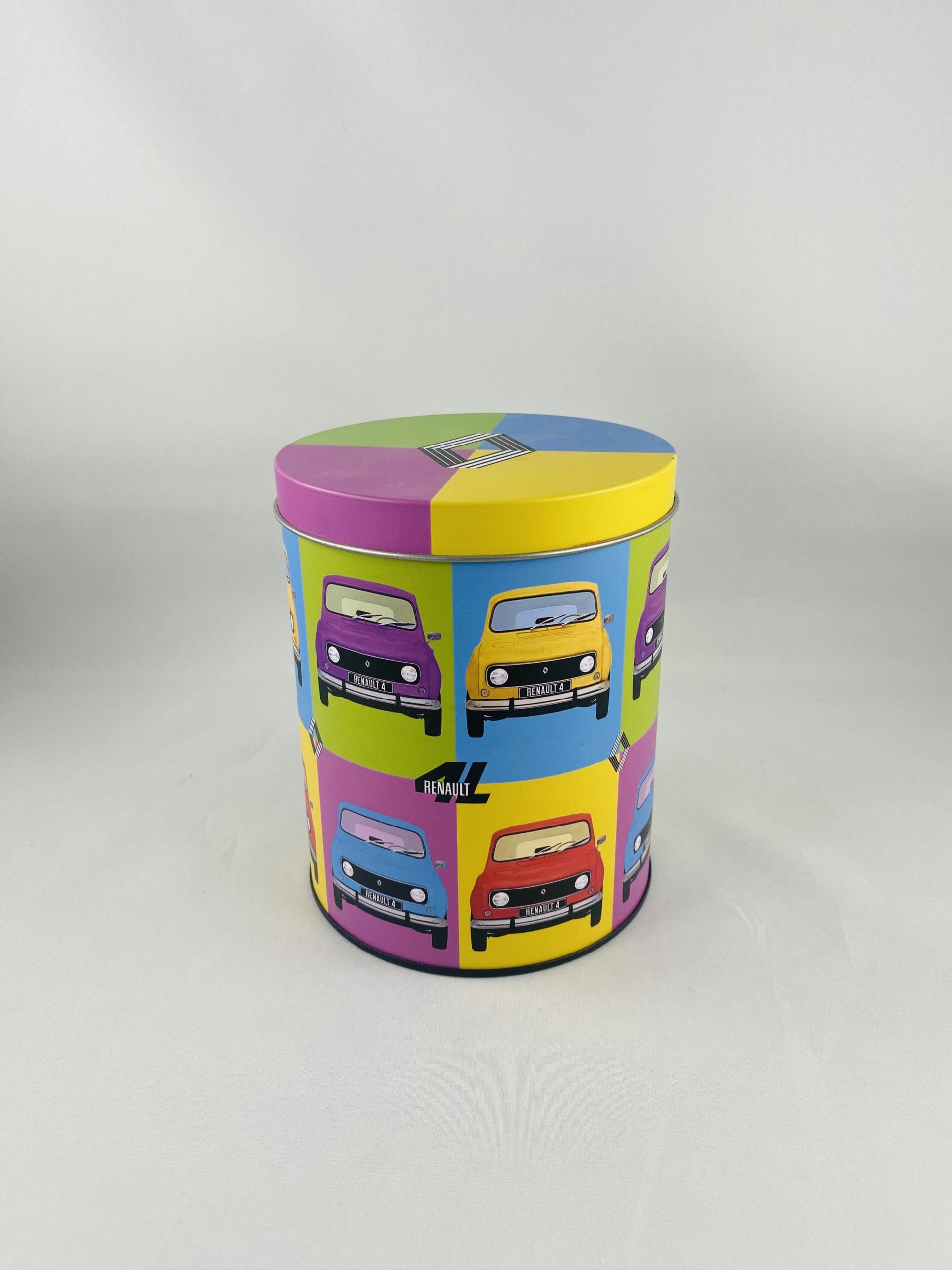 Boite vintage ‘Renault 4L – pop art’ en métal ronde pour sucre, gateaux, rangement bibelots, papiers.