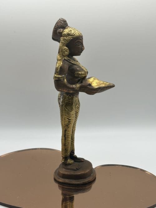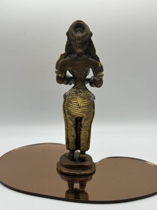 Cette statuette en bronzede la déesse Lakshmi incarne la beauté, la prospérité et la générosité. Avec ses multiples bras, elle est représentée tenant des symboles de richesse et d’abondance, comme une corne d’abondance et des pièces d’or. Son visage rayonne de grâce et de bienveillance, inspirant un sentiment de confiance et de sécurité. Chaque détail, des motifs complexes sur ses vêtements aux bijoux délicatement ciselés, témoigne du talent artisanal exceptionnel qui a donné vie à cette idole sacrée. Que ce soit comme objet de dévotion dans un sanctuaire personnel ou comme pièce maîtresse d’une décoration intérieure, cette statuette de Lakshmi apporte une touche de spiritualité et de richesse à tout environnement.