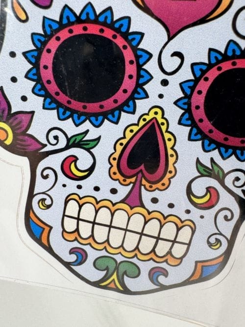 Un sticker Skull tête de mort bleu ciel avec un cœur et une serrure, un design audacieux mêlant mystère et douceur.