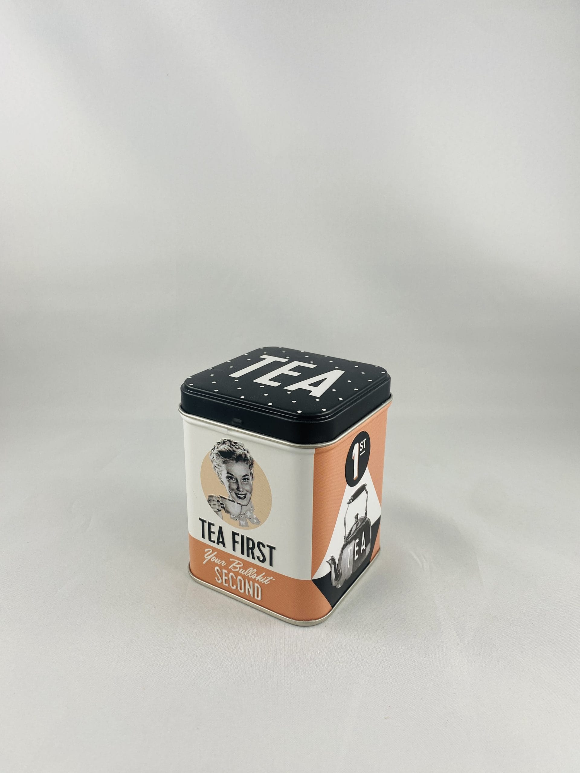 Boite vintage en métal ‘Tea first – Your bullshit second’ avec couvercle à rabat et à reliefs pour thé, sucre, gateaux, rangement bibelots, papiers.