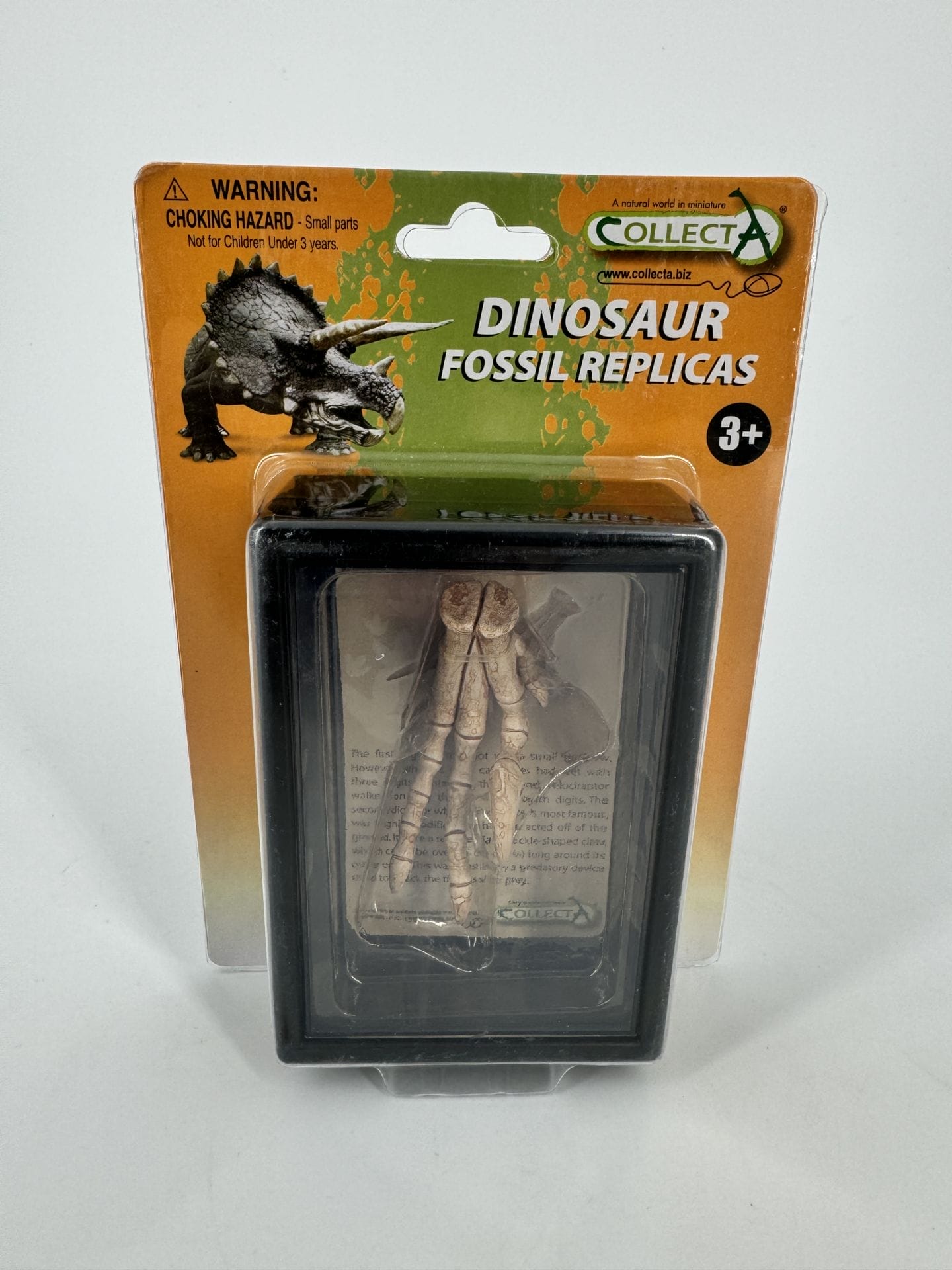 Le premier doigt du pied était un petit ergot. Cependant, alors que la plupart des carnivores avaient des pieds avec trois doigts en contact avec le sol, Velociraptor ne marchait que sur ses troisième et quatrième doigts. Le deuxième doigt, pour lequel Velociraptor est le plus connu, était très modifié et se tenait rétracté du sol. Il portait une griffe relativement grande, en forme de faucille, dont le bord extérieur pouvait mesurer plus de 6,5 cm de long. Cette réplique de sculpture très détaillée est livrée dans une boîte d’exposition avec un chevalet intégré et un crochet mural pour faciliter l’exposition. Une carte d’information est incluse dans la boîte d’exposition. Le spécimen peut être retiré pour être étudié et examiné de près.