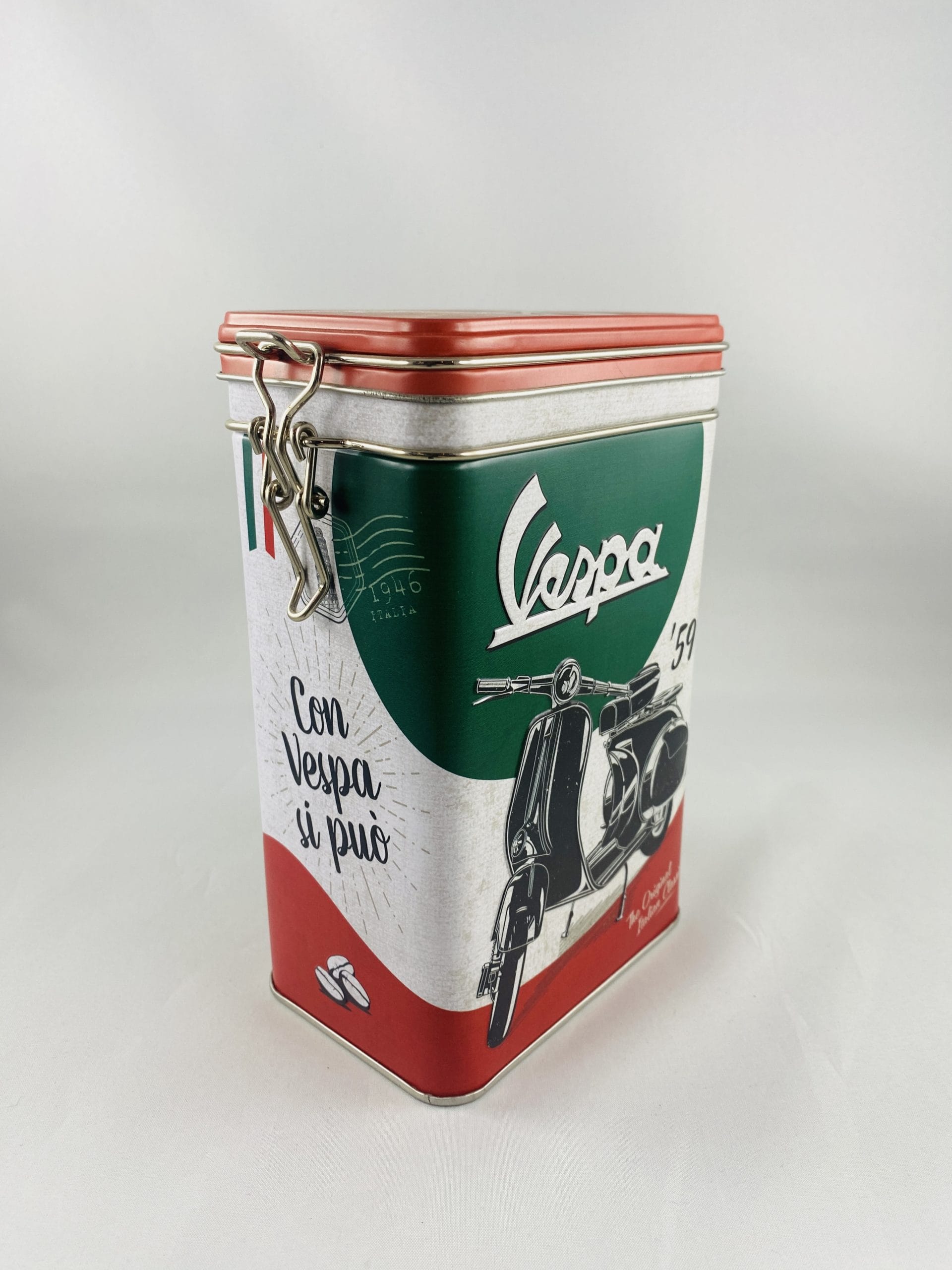 Boîte à café hermétique vintage en métal avec reliefs ‘Vespa ’59 Con Vespa si puo’, fermeture par loquet basculant.