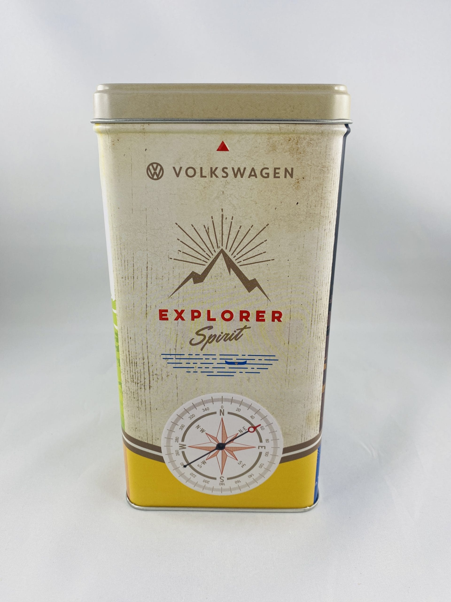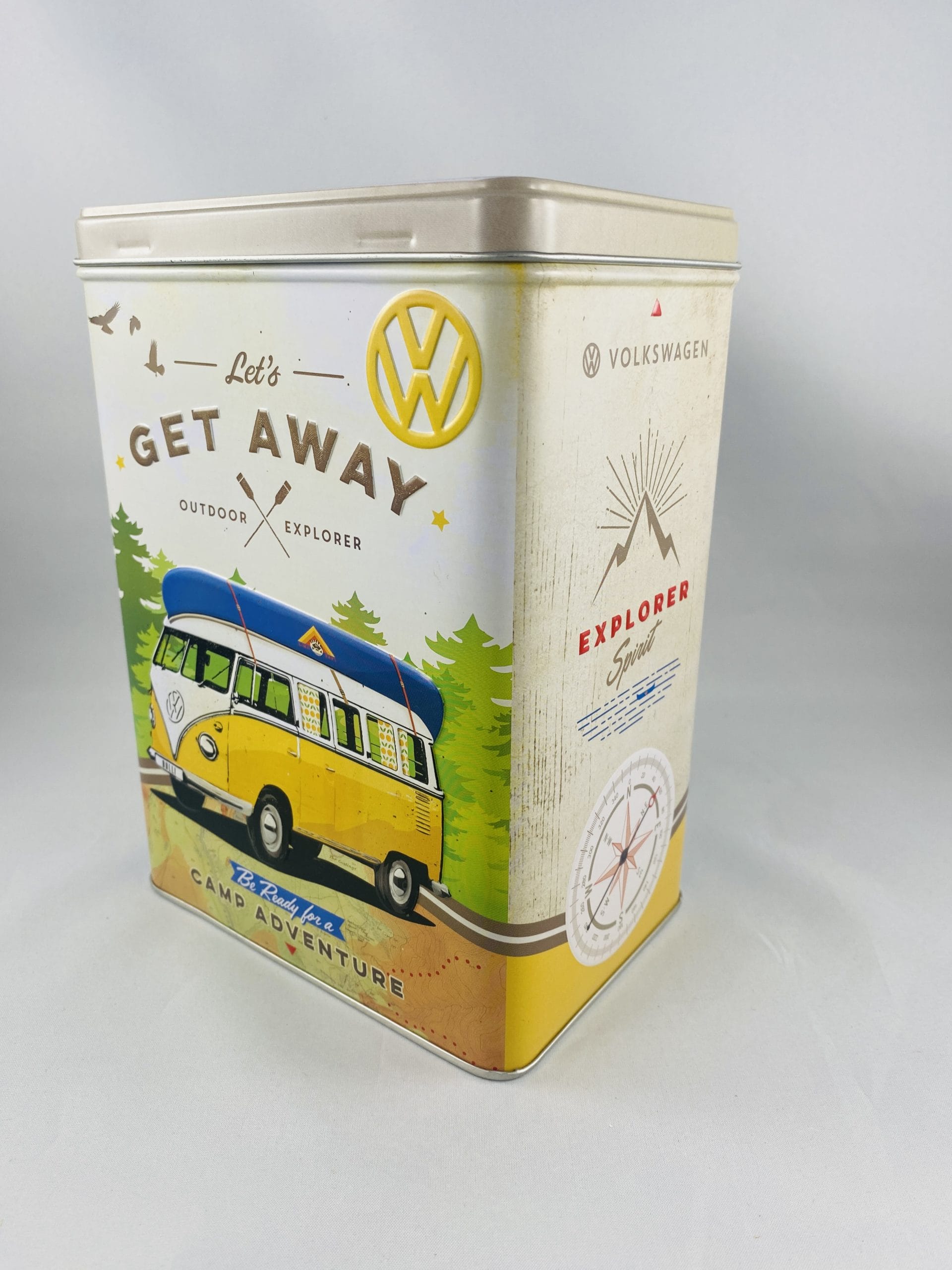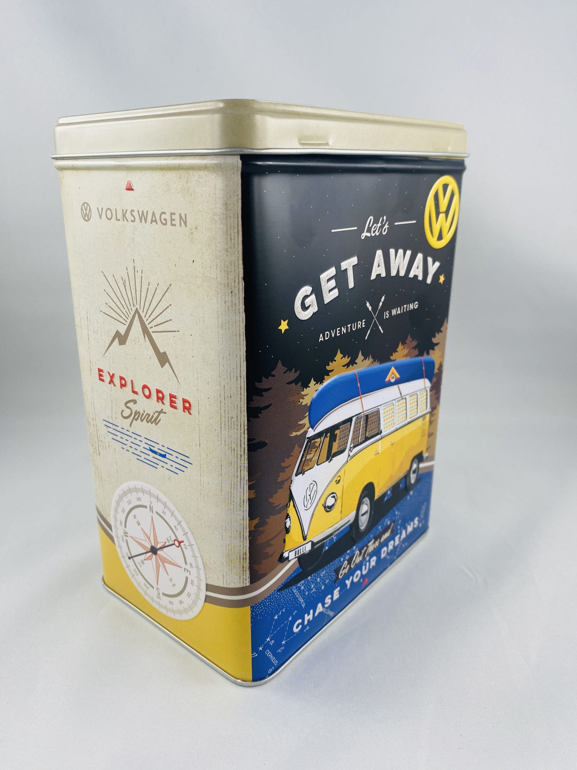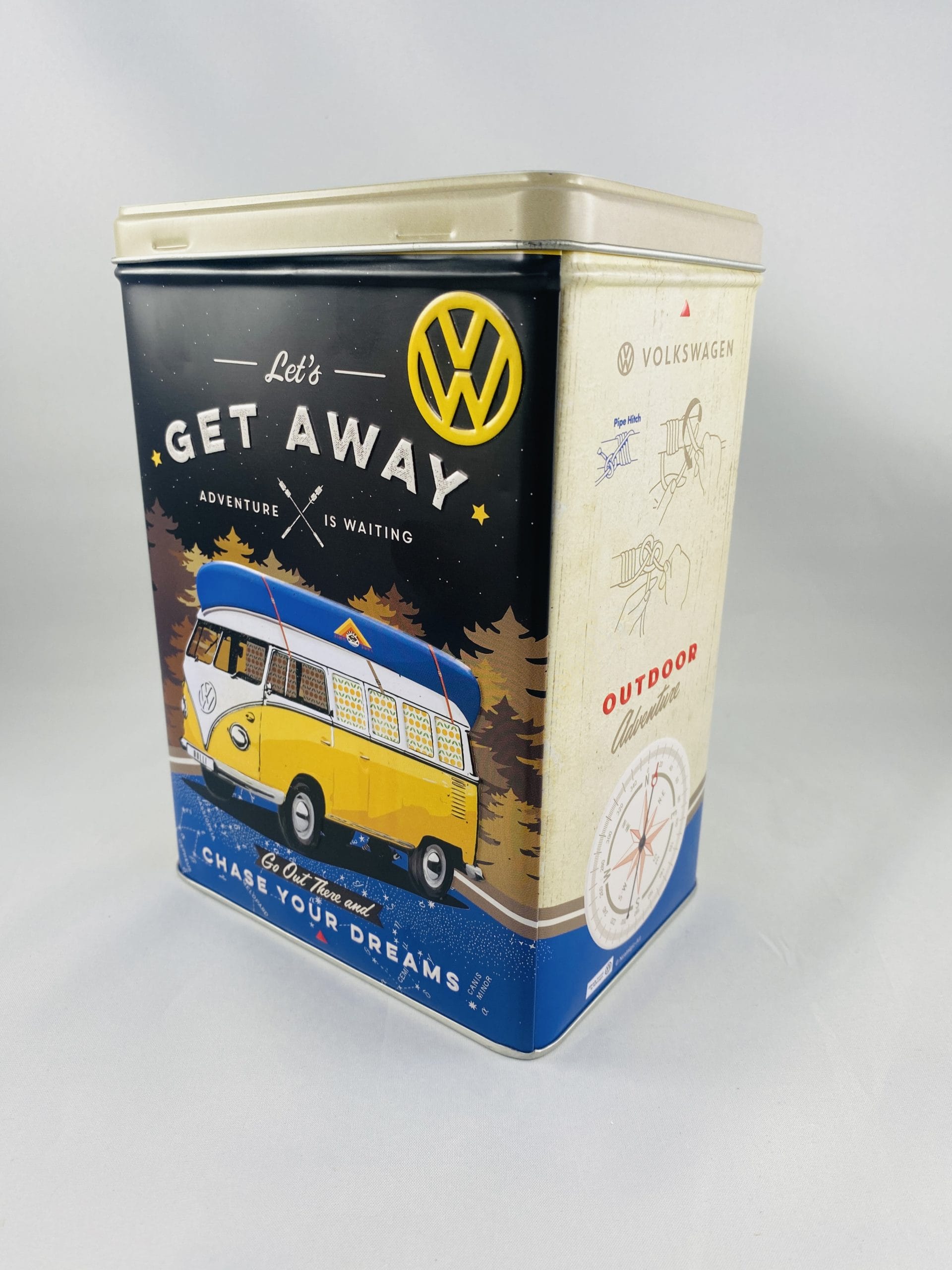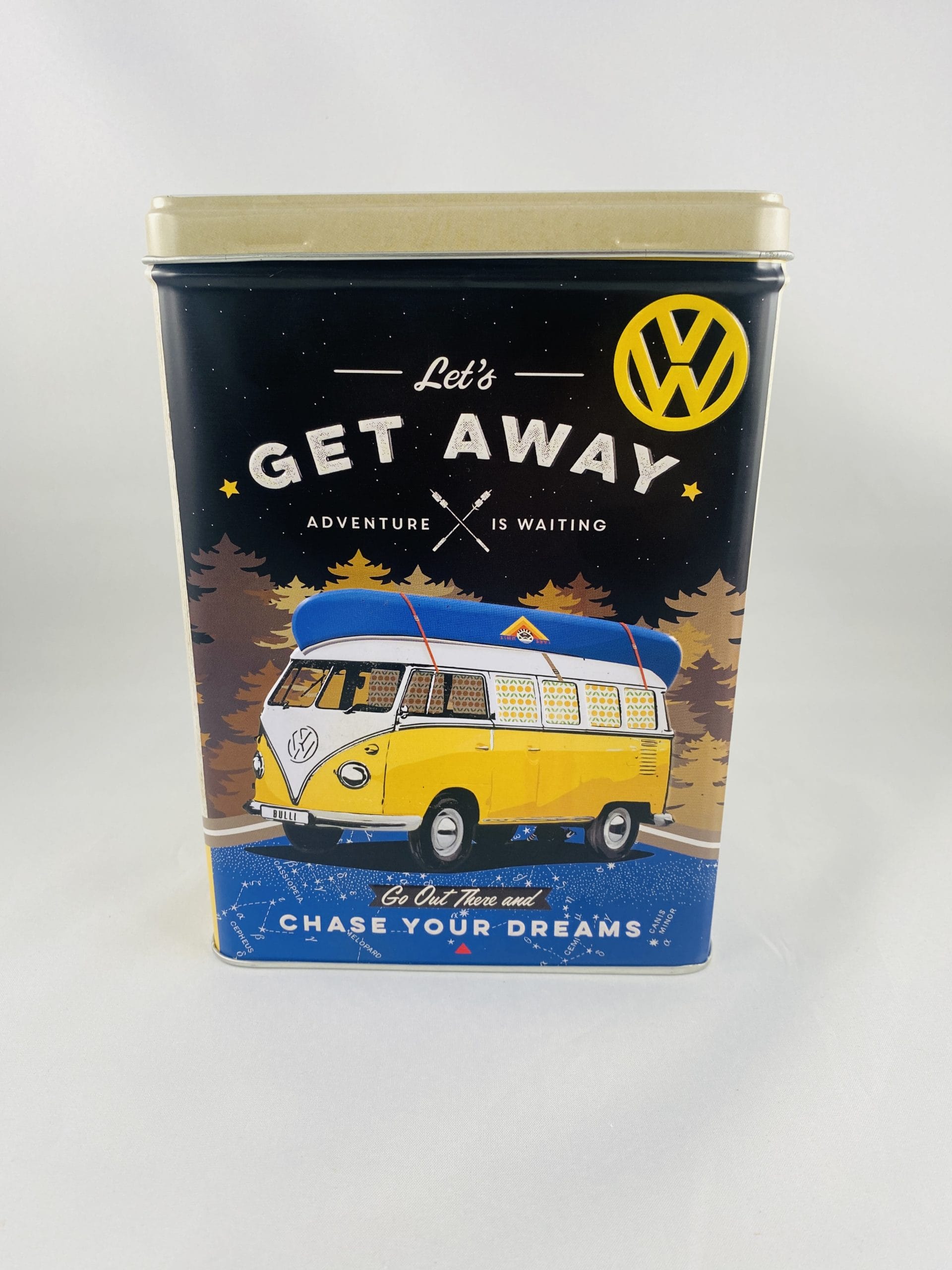 Retourner à la boutiqueBoite vintage en métal ‘Volkswagen Let’s get away – camp adventure – chase your dreams’ avec reliefs pour sucre, gateaux, rangement bibelots, papiers.